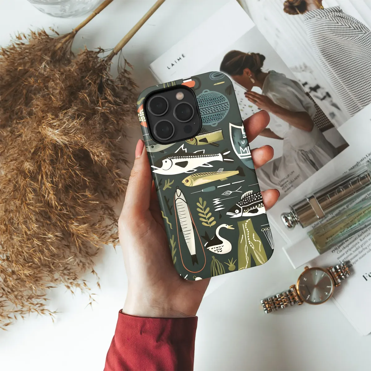 Carry your passion with you! This unique design features a charming array of stylized freshwater fish, fishing gear, and aquatic plants in a delightful Scandinavian-inspired pattern. The muted color palette of greens, browns, and oranges on a dark backdrop creates a sophisticated yet playful look. Perfect for the nature enthusiast, avid angler, or anyone who appreciates a touch of vintage charm, this eye-catching image will make your device stand out. Bring a little bit of the outdoors with you wherever you go. Great for gifts, stocking stuffer, presents. Show off your love for fishing, nature, and stylish design. Fresh Catch, fishing art, fish decor, lake life, aquatic illustration, outdoor style, retro design, modern art, art print, wall art.