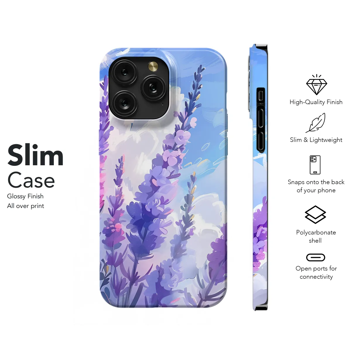 Protect your phone with this sleek and stylish lavender flower phone case. Made from durable materials, this case will keep your phone safe from scratches, bumps, and drops. The beautiful lavender flower design adds a touch of elegance to your phone, and the slim profile ensures that it won't add bulk to your device.