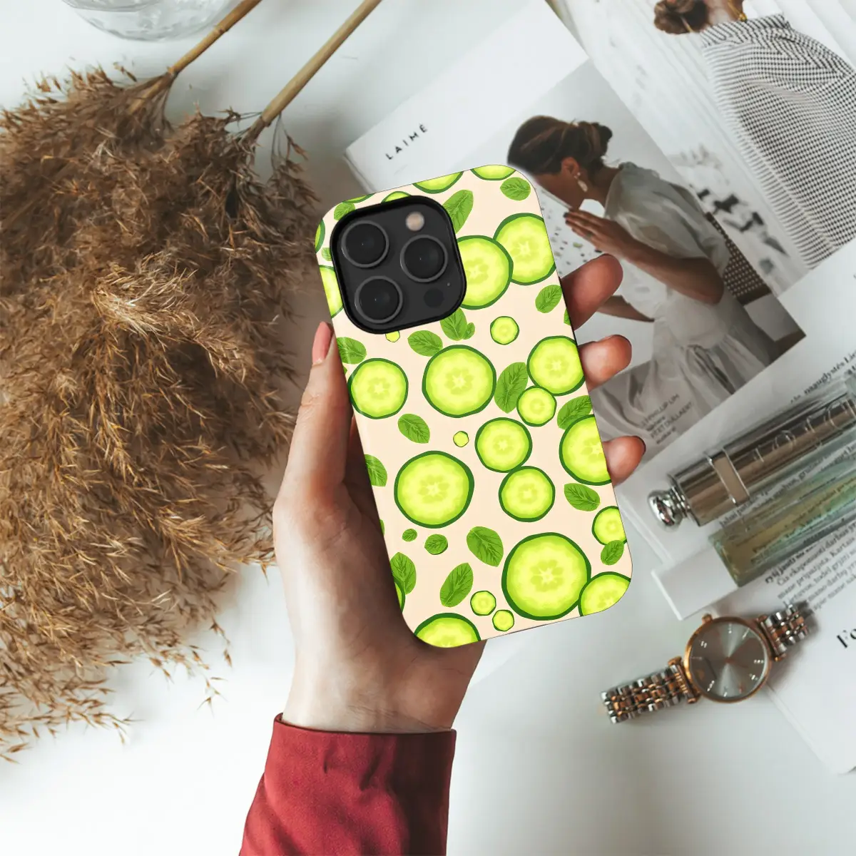 Embrace a fresh and vibrant look with this delightful cucumber and mint leaf design. This unique pattern features crisp, green cucumber slices scattered amongst fresh mint leaves on a subtle cream background. The playful arrangement creates a refreshing and summery aesthetic, perfect for anyone who loves healthy foods, gardening, or a touch of nature-inspired art. Its bright, clean look brings a bit of garden freshness to your everyday.