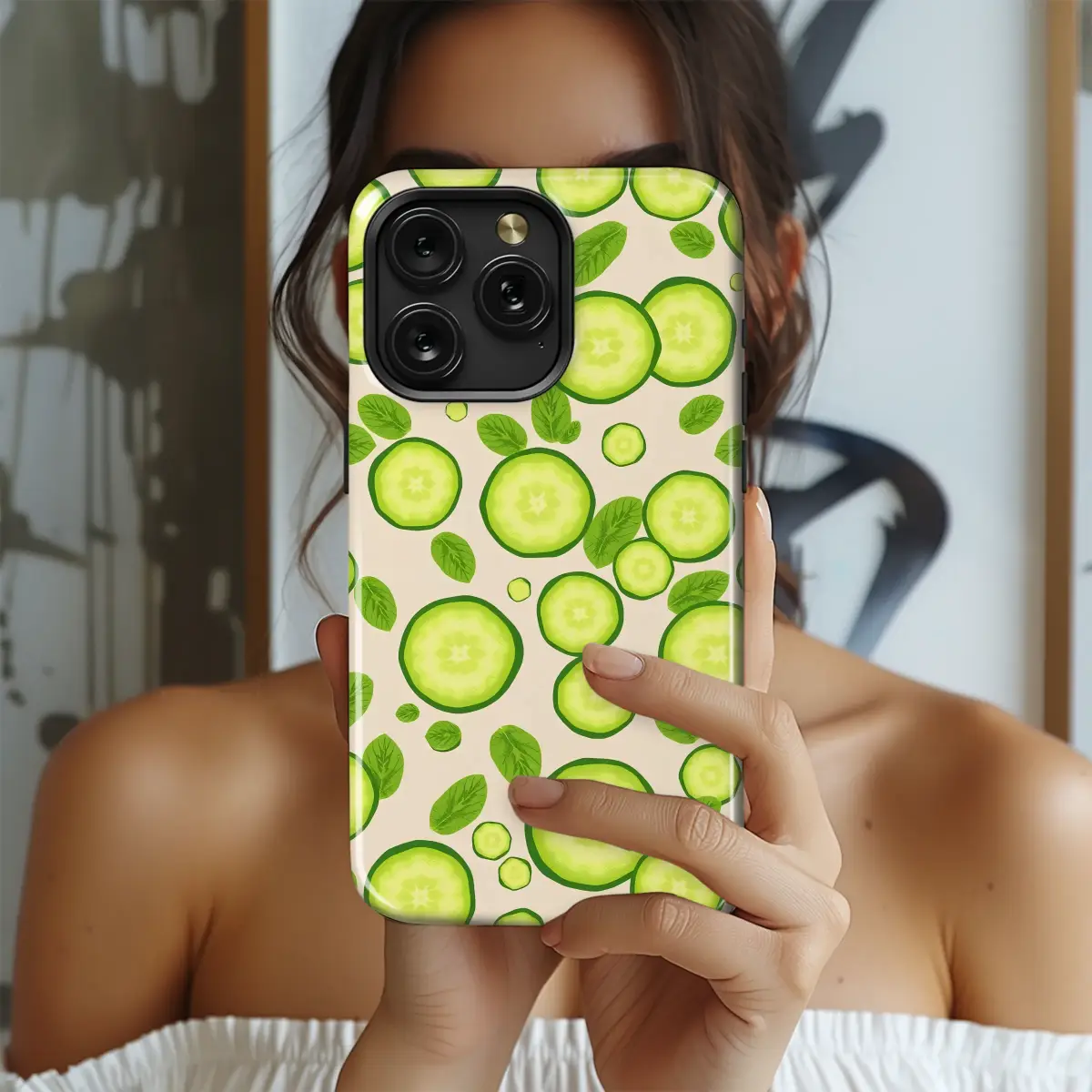 Embrace a fresh and vibrant look with this delightful cucumber and mint leaf design. This unique pattern features crisp, green cucumber slices scattered amongst fresh mint leaves on a subtle cream background. The playful arrangement creates a refreshing and summery aesthetic, perfect for anyone who loves healthy foods, gardening, or a touch of nature-inspired art. Its bright, clean look brings a bit of garden freshness to your everyday.