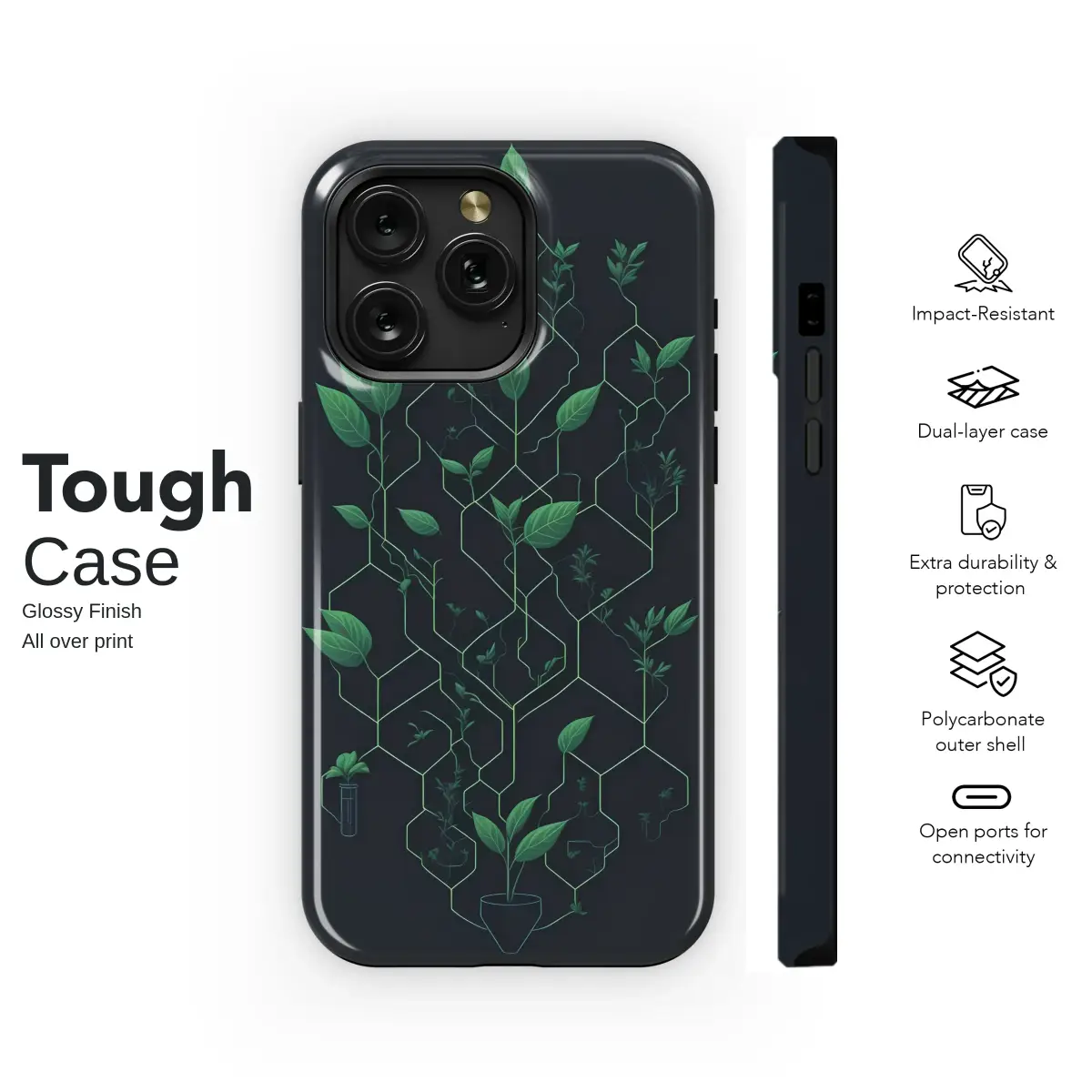 Embrace a fusion of nature and technology with this captivating botanical design. The artwork features an intricate network of luminous green geometric lines, from which vibrant leaves and plants sprout and grow. Set against a sophisticated dark background, this design creates a stunning visual of a futuristic, digital terrarium, blending organic beauty with modern, minimalist aesthetics.