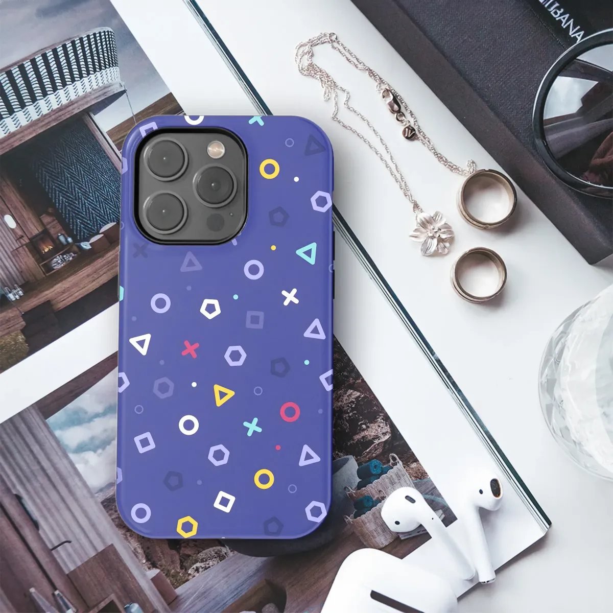 Add a pop of playful geometry to your everyday essentials with this vibrant, multicolored design. Featuring a scattered arrangement of circles, squares, triangles, and pentagons in a cheerful palette against a deep blue backdrop, this pattern is perfect for adding a touch of fun and personality to your style. The bold, graphic shapes create a visually engaging aesthetic that’s both modern and timeless. This eye-catching design is digitally printed using high-quality inks to ensure a durable and vibrant finish that will last. It's a unique way to express your individuality and add a whimsical element to your look, making it a great gift for yourself or someone special. This design is also available on a variety of products so you can coordinate your style. The bright colors and geometric shapes make it a great statement piece to turn heads wherever you go. Its simple yet striking pattern ensures it's universally appealing, effortlessly blending into different styles and settings. Upgrade your accessories today and experience the joy of personalized style. #geometric #pattern #colorful #design #accessories #gift #modern #whimsical #statementpiece #personalized