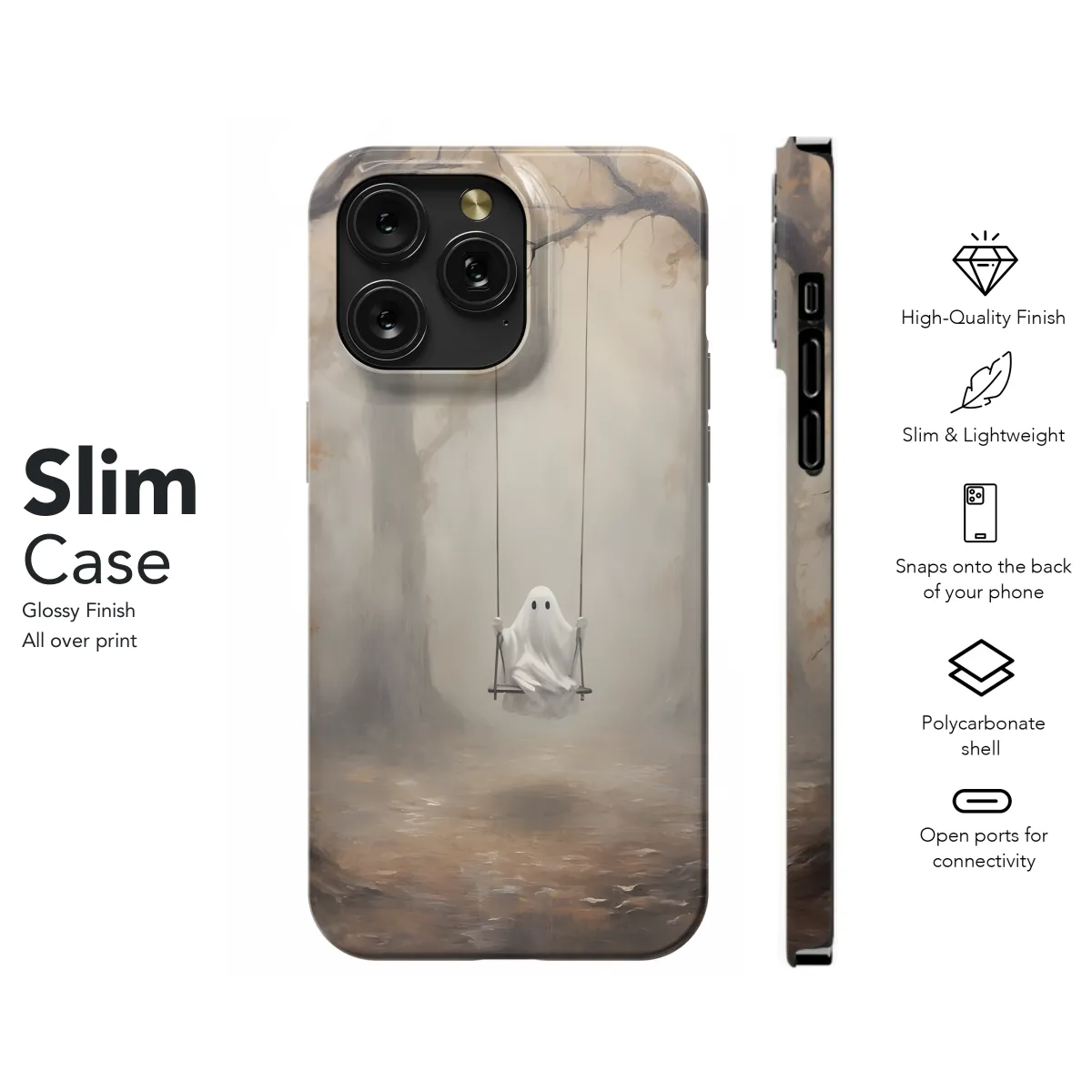 Embrace the ethereal with this Ghost on a Swing Phone Case. Its haunting design features a graceful ghost adorned with intricate patterns, suspended on a ghostly swing against a twilight sky. Crafted to protect your device with style, this case is a unique and enchanting companion for your smartphone, summoning a touch of the supernatural into your daily routine.