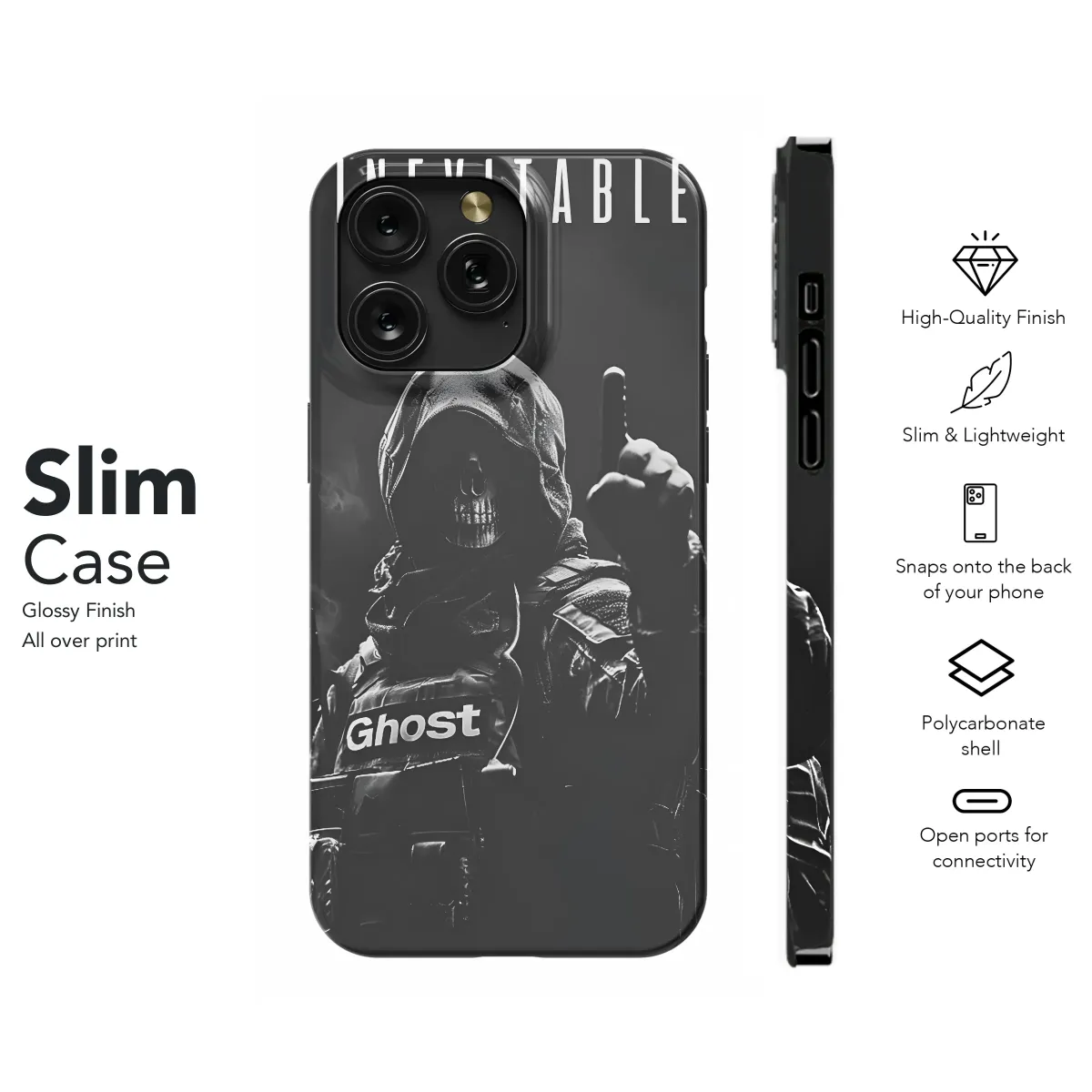 Unleash your inner shadow with this striking design. Featuring a hooded figure, shrouded in mystery and emblazoned with the word "Ghost," this graphic exudes power and intrigue. The stark monochrome palette emphasizes the intensity of the image, making it a bold statement piece. Perfect for those who appreciate dark aesthetics and a touch of the macabre, this design is as unique as you are. The high-quality print ensures vibrant colors and exceptional detail, resistant to fading and scratches. The design's edgy vibe makes it ideal for anyone who wants to make a statement without saying a word, bringing a cool, mysterious aura to your everyday carry. Transform your personal device into a canvas of self-expression with this captivating piece that is sure to be a conversation starter. Show off your individual style with this impactful, unforgettable design. This is more than just a graphic; it's a reflection of your enigmatic personality. Secure yours today and let the world know that you're a force to be reckoned with. The "Inevitable" text hints at a powerful, unstoppable force, adding another layer of depth to this impactful design.