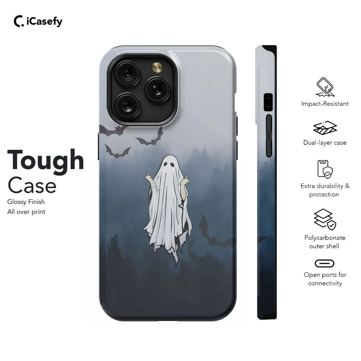Embrace the eerie vibes with this spooky phone case featuring a ghost, a haunting forest, bats, and a touch of attitude with two cheeky middle fingers. Inspired by the darker side of Halloween, this case adds a playful yet mysterious touch to your device. Let your phone reflect your love for all things spooky with this uniquely themed accessory.