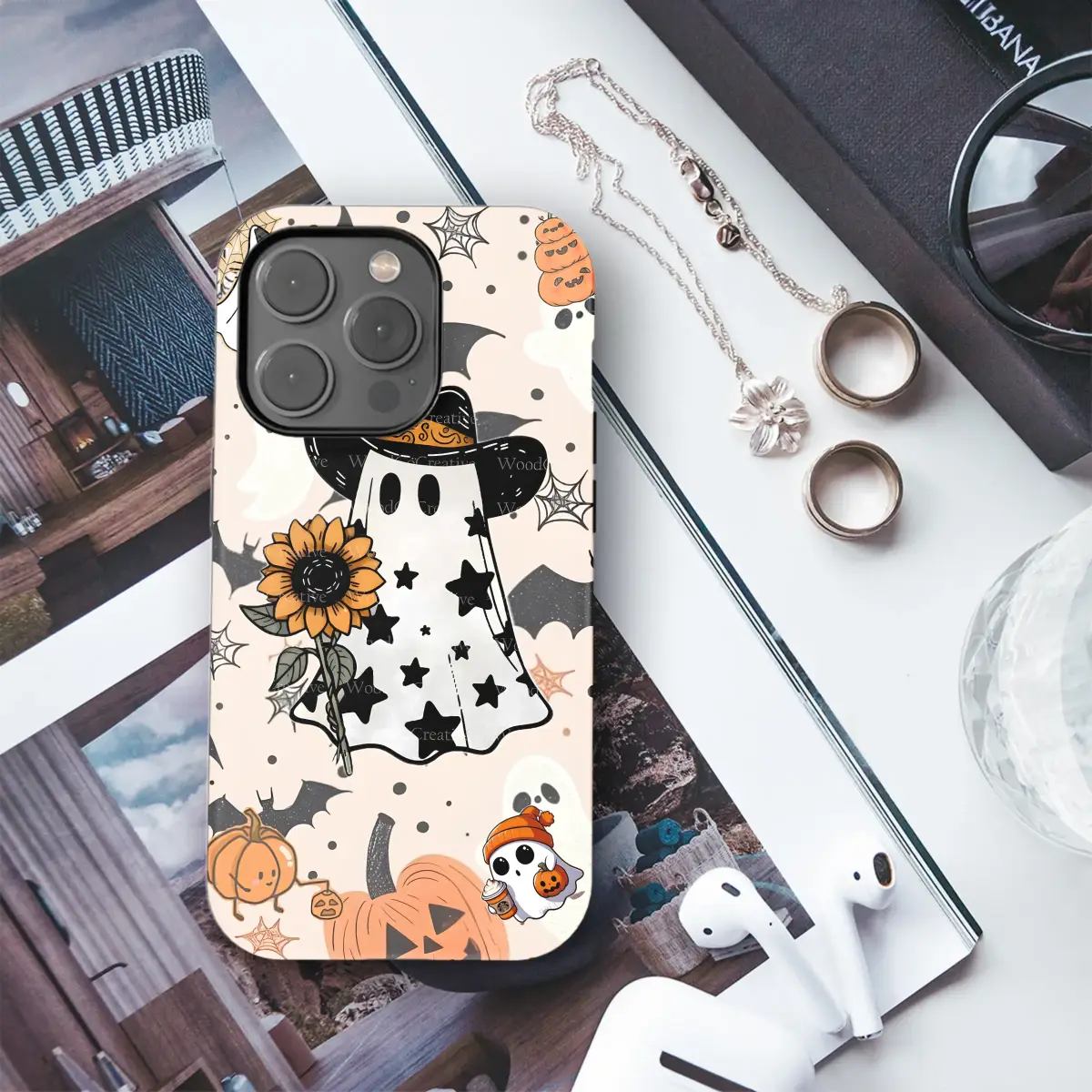 Step into a whimsical world where the spooky season is always in full swing with this enchanting illustrated pattern. Imagine a friendly cowboy ghost, his sheet adorned with playful black stars and his head topped with a classic western hat, offering a bright orange sunflower as a delightful autumn greeting. This isn't just any haunting; it's a heartwarming celebration of all things cute and cozy for fall, perfect for anyone who loves a cottagecore Halloween aesthetic. All around our charming spectral hero, a playful scene unfolds against a soft, creamy backdrop. Adorable little ghosts drift by, some balancing pumpkin stacks as hats, while a mischievous ghost cat peeks out from behind a delicate spiderweb. The entire design is a warm, inviting canvas filled with smiling jack-o'-lanterns, silhouetted bats soaring through the air, and a sprinkle of magical charm. This beautiful illustration perfectly captures the spirit of a playful Halloween, blending rustic western vibes with classic spooky fun. It's the ideal way to carry the joyful, spirited essence of autumn with you, transforming your everyday essential into a conversation piece that radiates warmth and whimsical charm. Let this delightful art bring a smile to your face and a touch of enchanted seasonal style to your daily adventures.