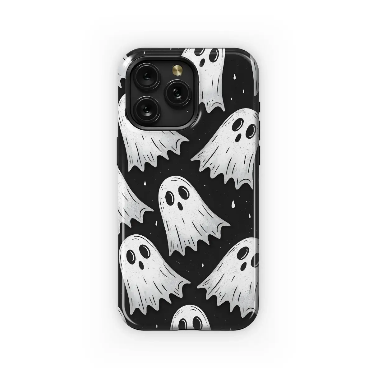 Embrace the spooky season all year long with this enchanting pattern, where a friendly haunt of little ghosts floats through a deep, textured midnight void. Each specter, with its wide, curious eyes and classic sheeted form, is rendered in a striking black and white linocut style that evokes a feeling of retro Halloween charm and vintage storybook magic. This design is a perfect match for the witchy soul, the lover of dark academia, or anyone with a whimsigoth aesthetic who finds beauty in the mysterious and the melancholic. It's more than just a pattern; it's a statement piece, a tiny wearable work of art that celebrates the strange and unusual. Let this parade of petite phantoms become your constant companions, wrapping your most essential everyday tool in a layer of unique, illustrative protection. Carry a little bit of otherworldly charm in your pocket or purse, making it the perfect gothic gift for your best ghoul-friend or a wonderfully spooky treat for yourself. Guard your daily connection to the world with a design that's as unique and spirited as you are, a constant reminder of the delightful magic hiding just beyond the veil.