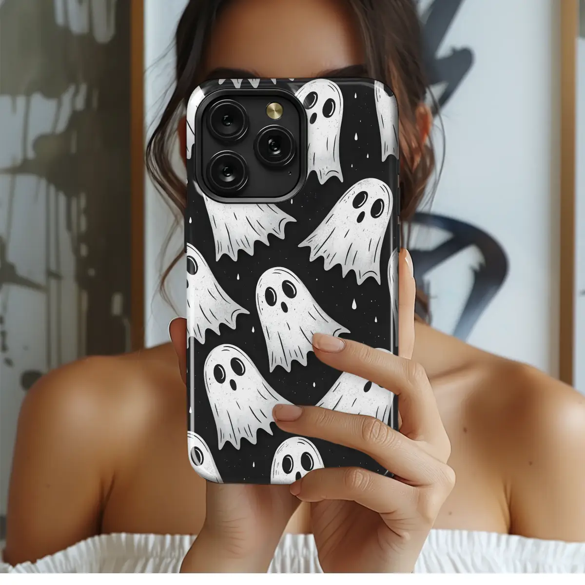 Embrace the spooky season all year long with this enchanting pattern, where a friendly haunt of little ghosts floats through a deep, textured midnight void. Each specter, with its wide, curious eyes and classic sheeted form, is rendered in a striking black and white linocut style that evokes a feeling of retro Halloween charm and vintage storybook magic. This design is a perfect match for the witchy soul, the lover of dark academia, or anyone with a whimsigoth aesthetic who finds beauty in the mysterious and the melancholic. It's more than just a pattern; it's a statement piece, a tiny wearable work of art that celebrates the strange and unusual. Let this parade of petite phantoms become your constant companions, wrapping your most essential everyday tool in a layer of unique, illustrative protection. Carry a little bit of otherworldly charm in your pocket or purse, making it the perfect gothic gift for your best ghoul-friend or a wonderfully spooky treat for yourself. Guard your daily connection to the world with a design that's as unique and spirited as you are, a constant reminder of the delightful magic hiding just beyond the veil.