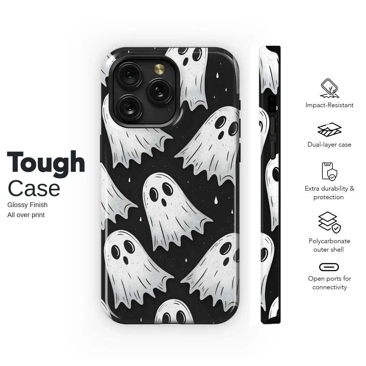 Embrace the spooky season all year long with this enchanting pattern, where a friendly haunt of little ghosts floats through a deep, textured midnight void. Each specter, with its wide, curious eyes and classic sheeted form, is rendered in a striking black and white linocut style that evokes a feeling of retro Halloween charm and vintage storybook magic. This design is a perfect match for the witchy soul, the lover of dark academia, or anyone with a whimsigoth aesthetic who finds beauty in the mysterious and the melancholic. It's more than just a pattern; it's a statement piece, a tiny wearable work of art that celebrates the strange and unusual. Let this parade of petite phantoms become your constant companions, wrapping your most essential everyday tool in a layer of unique, illustrative protection. Carry a little bit of otherworldly charm in your pocket or purse, making it the perfect gothic gift for your best ghoul-friend or a wonderfully spooky treat for yourself. Guard your daily connection to the world with a design that's as unique and spirited as you are, a constant reminder of the delightful magic hiding just beyond the veil.