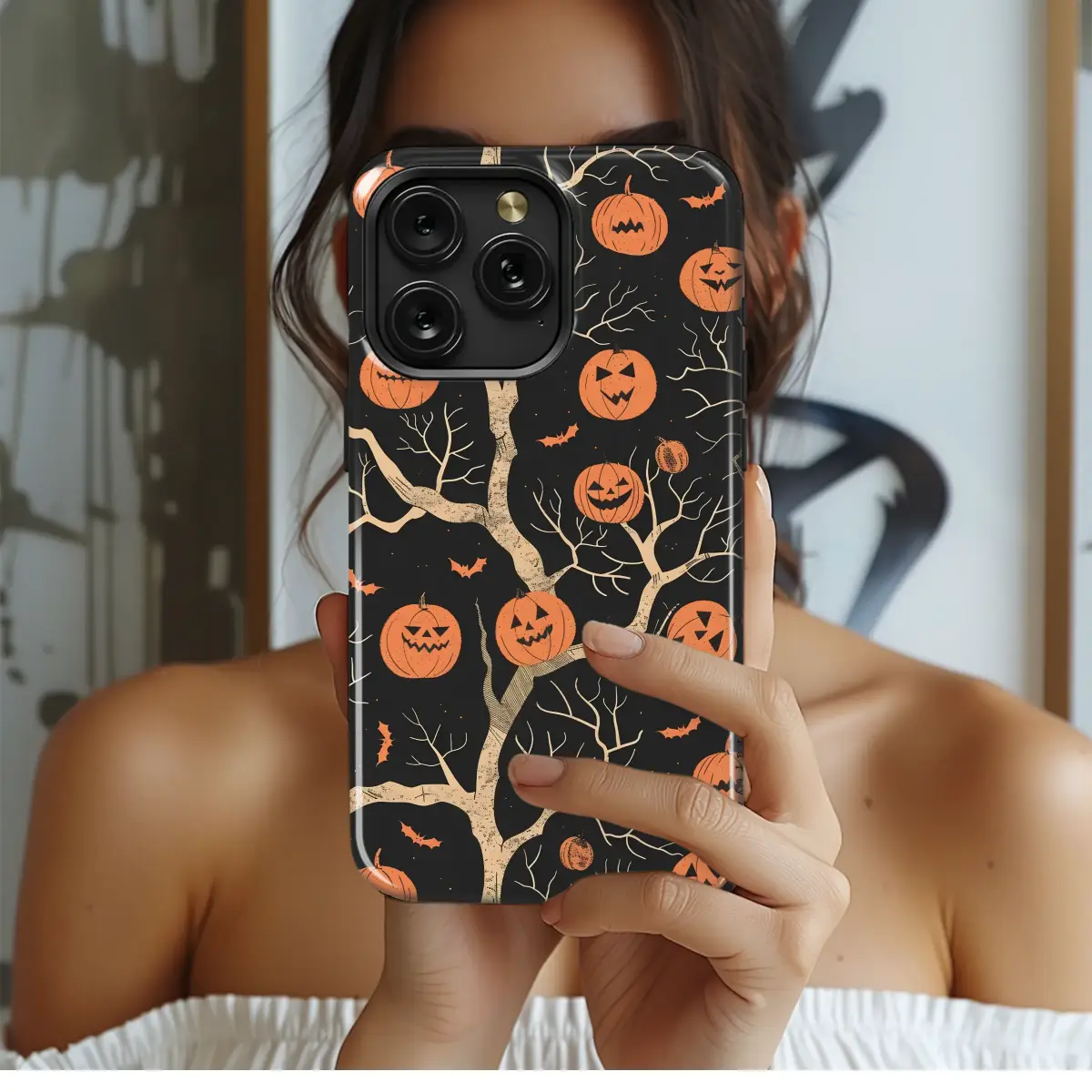 Step into a moonless autumn night where magic and mischief intertwine. Our exclusive design captures the heart of Halloween with a whimsically eerie scene, featuring a gnarled, ancient tree that bears a peculiar fruit: glowing jack-o'-lanterns. Each pumpkin grins with its own unique, mischievous personality, their warm orange light cutting through the deep, velvety black of the midnight sky. Tiny, silhouetted bats flutter between the bare branches, adding to the enchanting, spooky atmosphere. This vintage-inspired artwork evokes a sense of nostalgic charm, reminiscent of classic Halloween tales and crisp fall evenings. The textured, retro illustration style brings a timeless quality to the ghoulish grove, making it a perfect accessory for anyone who carries the spirit of the season with them. Let this captivating design wrap your favorite device in the chilling delight and cozy mystery of All Hallows' Eve. It's a piece of wearable art that celebrates the delightfully dark and the playfully spooky, ensuring you stand out in any haunted gathering or pumpkin patch adventure.