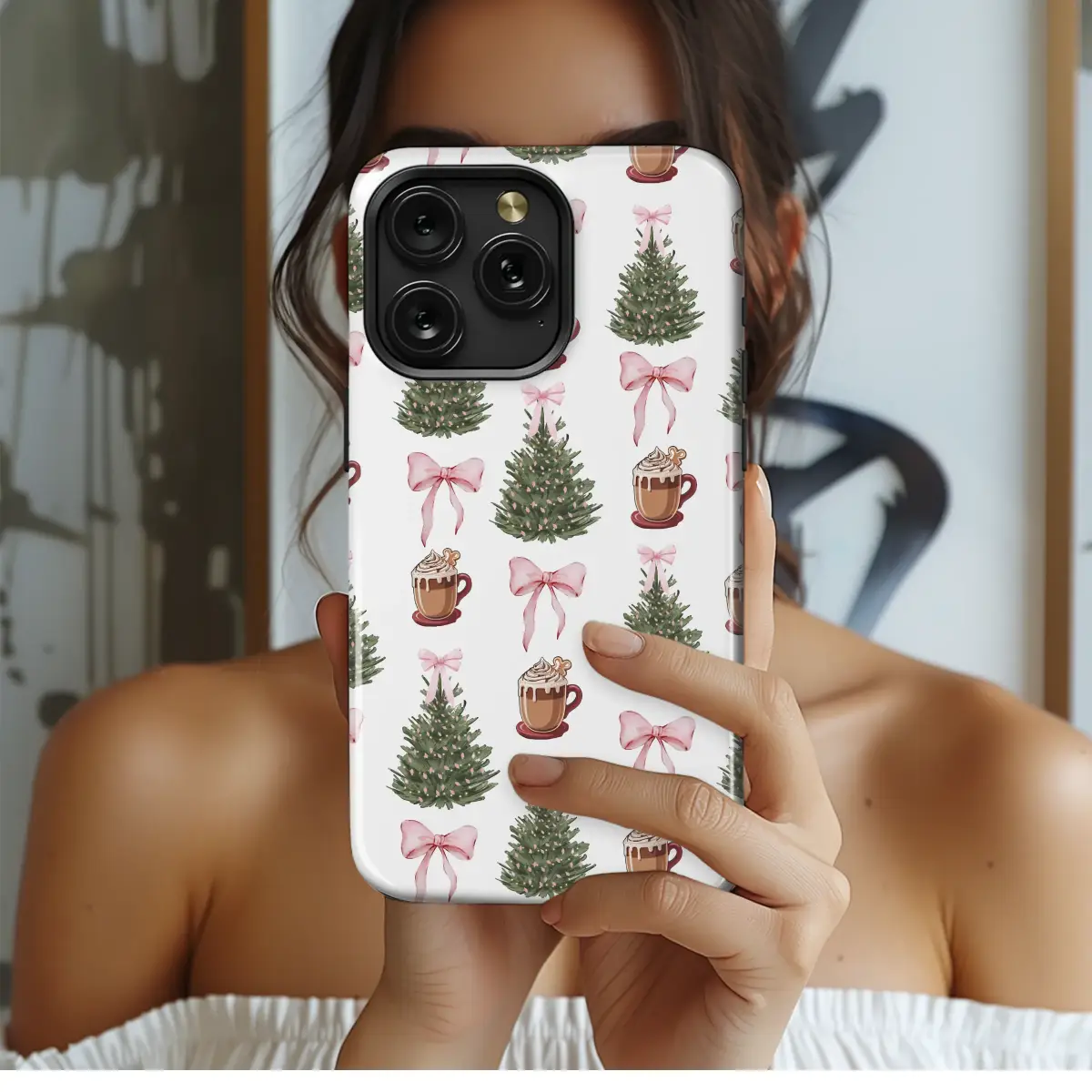 Embrace the holiday season with this charming and cozy Christmas design. This festive pattern features beautifully illustrated Christmas trees adorned with delicate pink lights and bows, alongside steaming mugs of hot cocoa topped with whipped cream and a gingerbread man. The whimsical pink bows scattered throughout add a sweet, girly touch to this unique holiday artwork, perfect for adding a touch of winter cheer.
