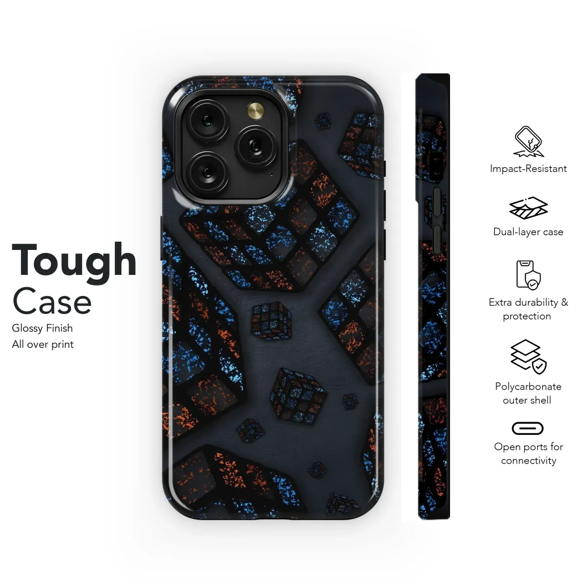 Transform your everyday tech with this captivating geometric pattern! This stunning design features an array of multifaceted cubes, each tile a mesmerizing blend of electric blue and fiery orange against a sleek, dark backdrop. The fragmented texture adds depth and visual interest, creating a modern and edgy aesthetic. Perfect for anyone who appreciates abstract art, 3D design, or a touch of futuristic flair. Let this unique piece of art be a statement of your individuality. Ideal for tech accessories, it provides a sleek and stylish way to protect your device while showcasing a bold, contemporary pattern. Stand out from the crowd with this eye-catching, abstract cube design. Grab yours now and add a touch of modern art to your everyday life! Consider it as a great gift for puzzle enthusiast, art lover, for him or her.