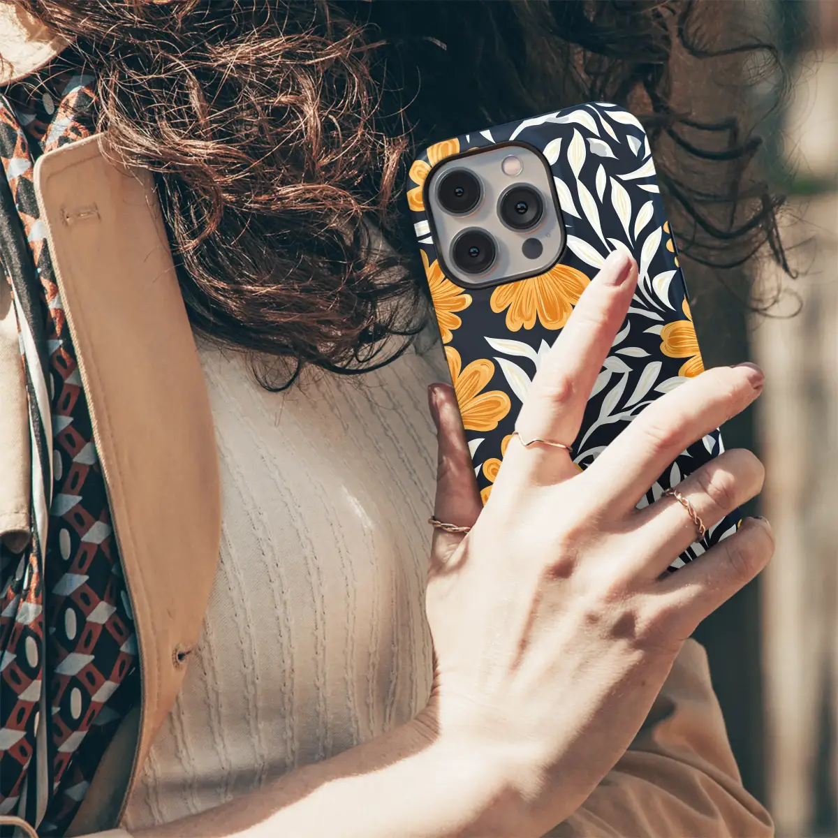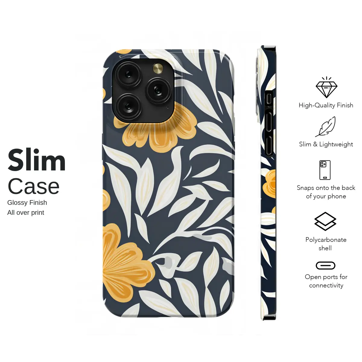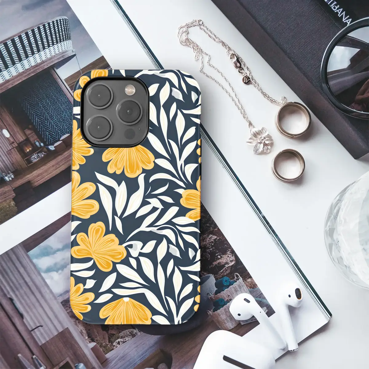 Step into a secret garden where golden hour lasts forever with this captivating botanical artwork. Imagine bold, marigold-hued blossoms, bursting with joyful energy and radiant warmth, unfurling against a deep and mysterious midnight navy canvas. Elegant, swirling tendrils of creamy white and soft ivory leaves dance between the flowers, creating a stunning visual contrast and a sense of graceful, organic movement. This modern floral pattern is a beautiful fusion of classic Art Nouveau elegance and a clean, contemporary graphic style, resulting in a sophisticated and truly eye-catching piece of wearable art. The rich, high-contrast color palette of deep navy and golden yellow evokes a feeling of luxurious warmth, timeless charm, and a touch of artistic mystery. It's more than just a pattern; it’s an entire mood, a statement of appreciation for nature's vibrant, stylized beauty. This elegant design is the perfect way to infuse your daily routine with a dose of artistic flair and natural elegance. Let this enchanting floral artwork wrap your most-used accessory, transforming it into a unique expression of your personal style and a conversation starter. It makes an ideal and thoughtful gift for the art lover, the design enthusiast, the modern gardener, or anyone who seeks to carry a small masterpiece with them every day.