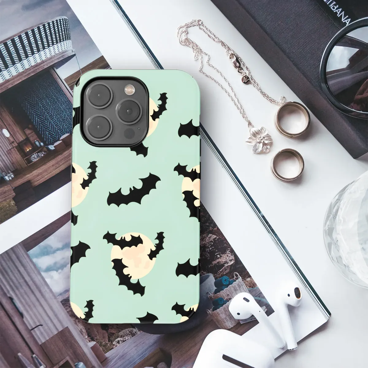 Embrace the whimsical magic of the midnight hour with this enchanting artwork, where inky black bat silhouettes perform a silent ballet across the face of a pale, luminous moon. Set against a dreamy, soft mint green sky, this captivating seamless pattern captures the enchanting duality of spooky and sweet, creating a visual story that is both charming and mysterious. Each little bat seems to tell a tale of nocturnal adventure, flying freely in a celestial dance under the soft, ethereal glow. This design is a true love letter to the night, perfect for those who find profound beauty in the shadows and undeniable magic in the moonlight. It's an ideal accessory for the modern romantic, the lover of gothic aesthetic, pastel goth charm, and all things with a witchy vibe. It adds a subtle touch of dark academia elegance and celestial mystery to your most essential personal items. Whether you're deep into the spooky season or you celebrate a Halloween state of mind all year long, this unique art elevates your gear from simple to utterly spellbinding. Let this creepy cute design be your personal emblem of the night, a stylish nod to your wonderfully weird spirit.