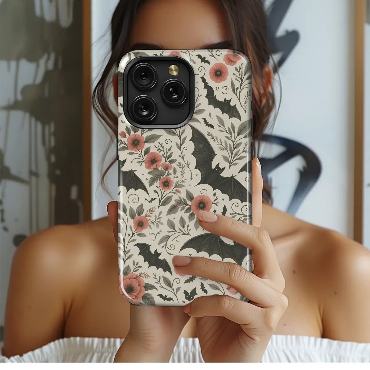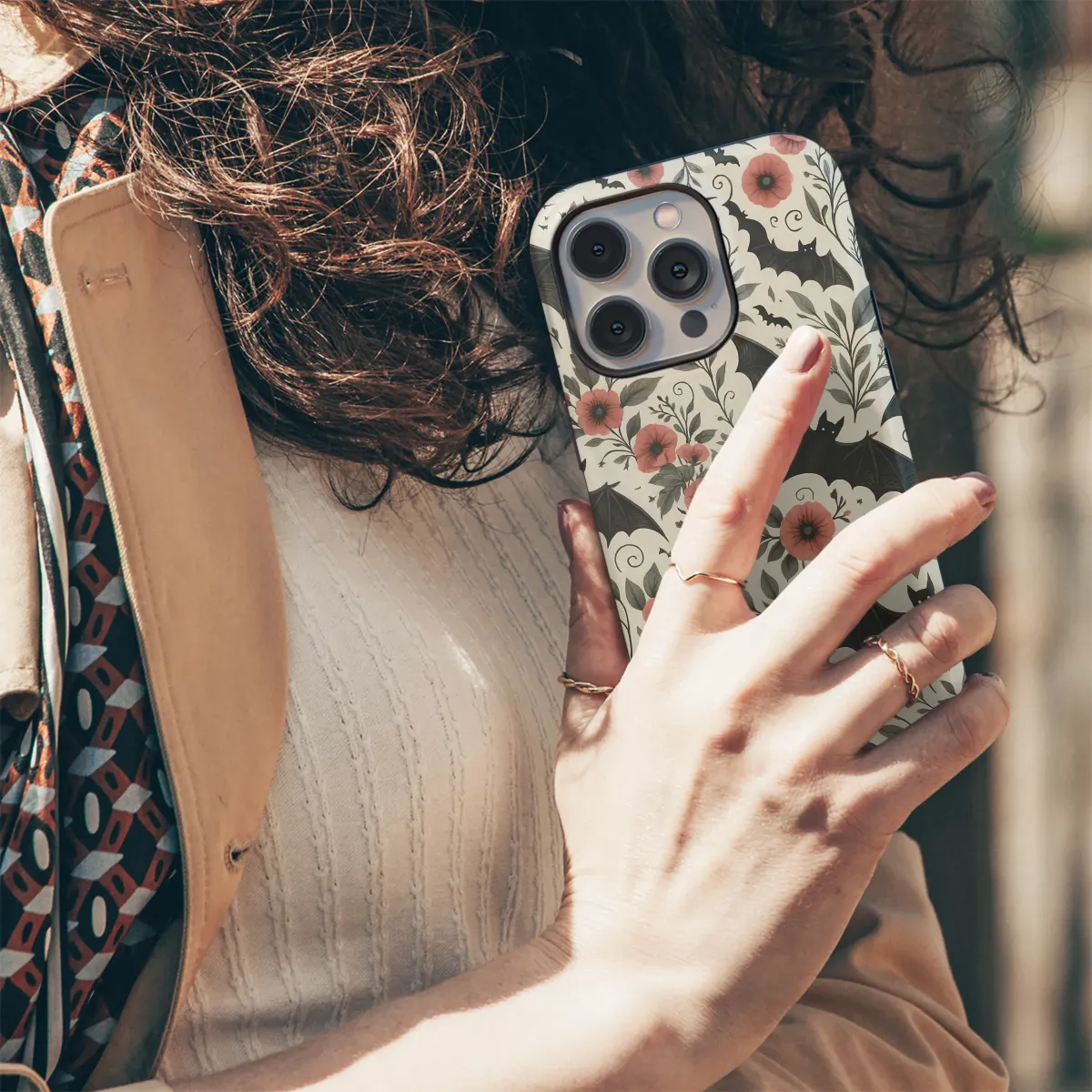 Wander into an enchanted twilight garden where the veil between worlds thins and nocturnal magic takes flight. This captivating design captures a delicate dance between night and nature, a hauntingly beautiful pattern for the modern romantic goth or dark academia enthusiast. Charcoal-black bats with intricately detailed, silken wings glide silently through a lush tangle of muted sage and olive botanicals. Their silent flight is a whisper against the creamy, vintage-inspired backdrop, dotted with tiny, distant stars. Intertwined with swirling vines and delicate, shadowy leaves are blooming poppies of dusty rose and faded coral, adding a soft, unexpected warmth to the beautifully moody composition. This artwork is a perfect fusion of gothic charm and cottagegore aesthetics, evoking the feeling of a forgotten fairytale illustration or a secret garden that blooms only under the moon. Ideal for anyone who appreciates a touch of macabre elegance, this whimsigoth design adds a layer of mysterious charm and spooky sophistication to your personal style. It’s an ode to the beauty found in the shadows, a perfect accessory for crisp autumn evenings, Halloween celebrations, or for the year-round lover of all things wonderfully strange and beautifully dark.