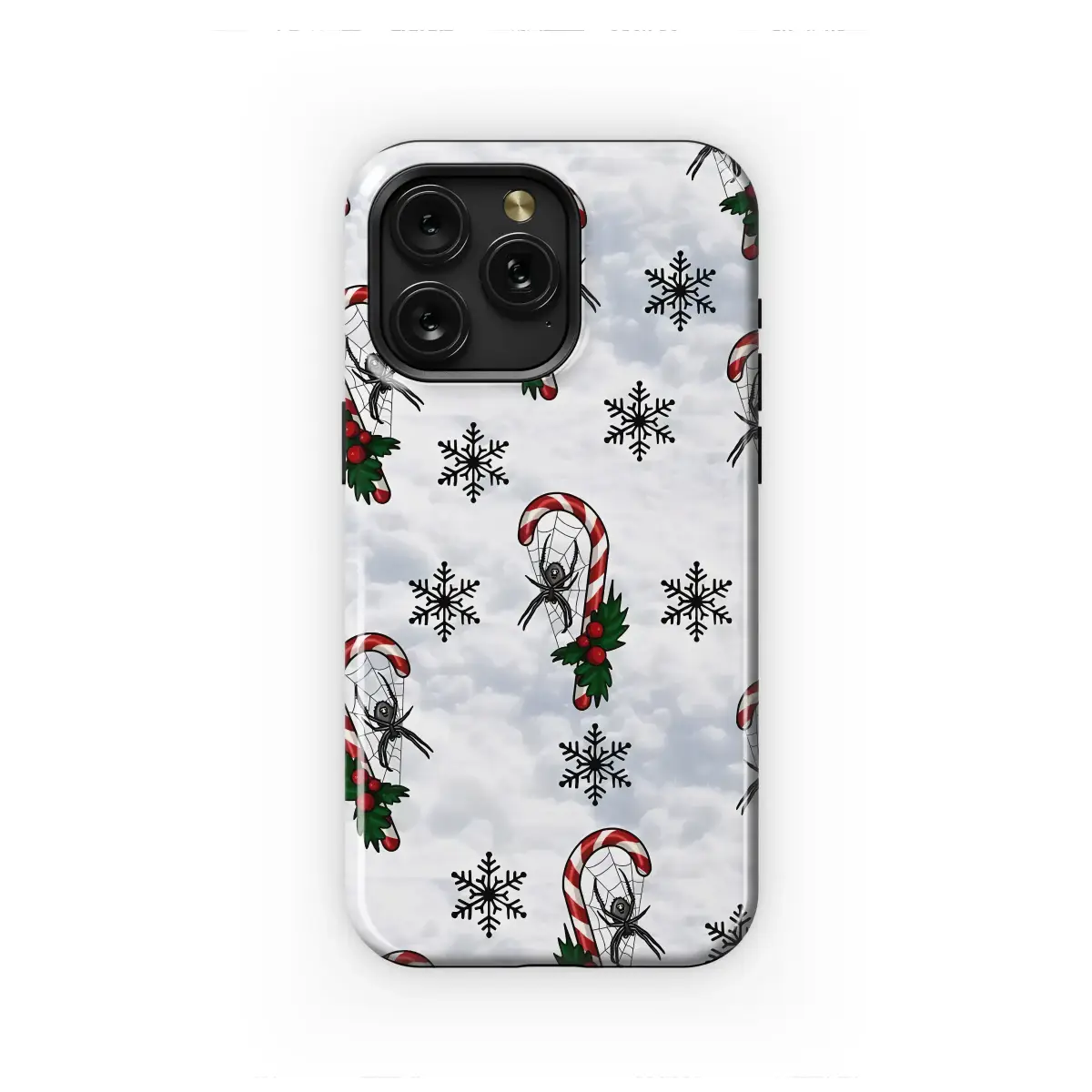 Embrace a delightfully spooky holiday with this unique Gothic Christmas pattern. This design features classic red and white striped candy canes, each adorned with a detailed black spider resting on its web. Contrasted against a snowy sky, this pattern is scattered with black snowflakes and festive holly, creating a perfect blend of creepy and festive for an alternative, goth-inspired aesthetic.