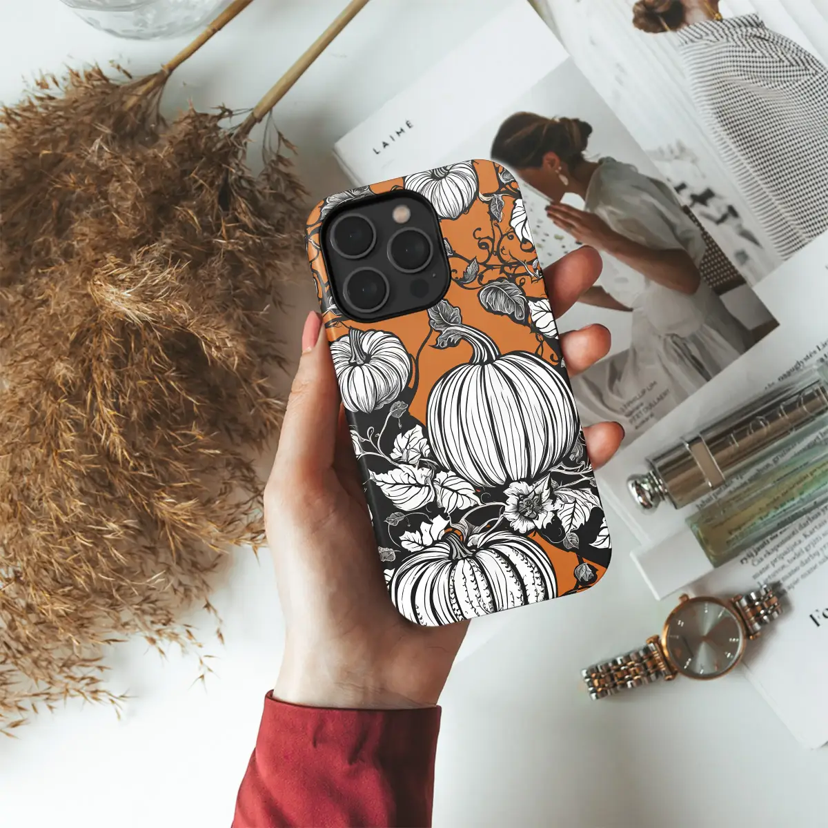 Embrace the magic of the harvest season with this captivating midnight pumpkin patch design, a perfect touch of autumnal enchantment for your daily carry. Imagine wandering through an enchanted field under a harvest moon, where bold, graphic pumpkins pop against a warm, marmalade-orange sky. This intricate linocut-style illustration captures that feeling perfectly, with stark white gourds and dramatic, shadowy leaves tangled in a beautiful, sprawling vine. The contrast between the vibrant orange, the deep midnight black, and the crisp white creates a stunning visual that is both cozy and chicly spooky. It’s the ultimate accessory for the spooky season, blending a cozy fall aesthetic with a touch of whimsical goth and dark cottagecore charm. Let this botanical artwork transform your most essential tech into a statement piece that celebrates your love for all things autumnal and mysterious. Whether you're a lover of classic Halloween vibes or simply adore unique, artistic patterns, this design offers a sophisticated way to wrap your device in the spirit of fall. It makes a thoughtful and unique gift for the witchy soul in your life, or a special treat to keep the magic of October with you all year long.