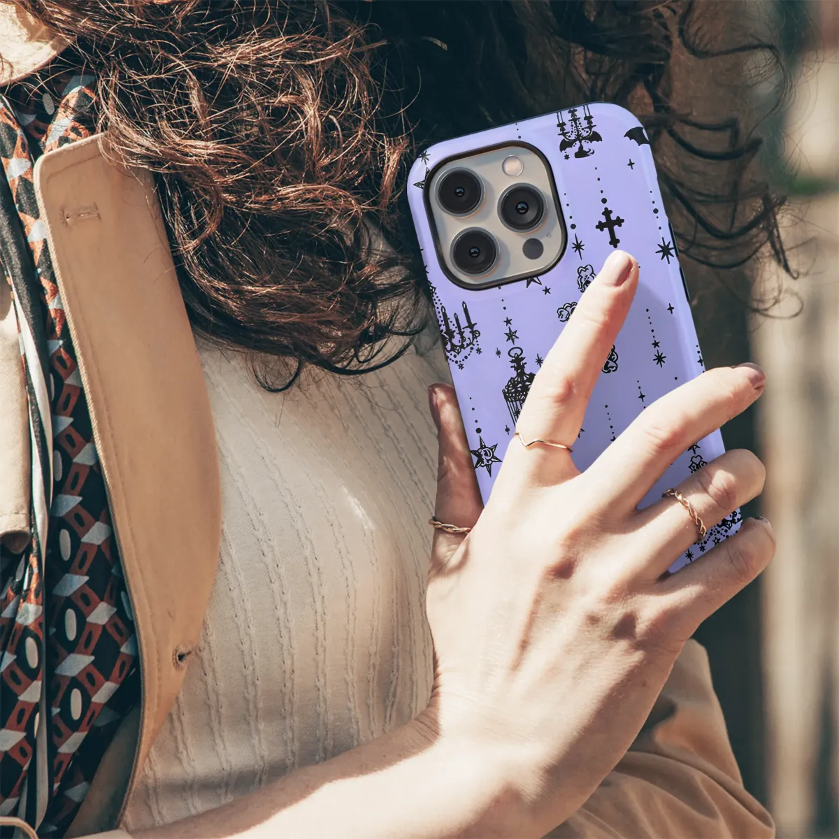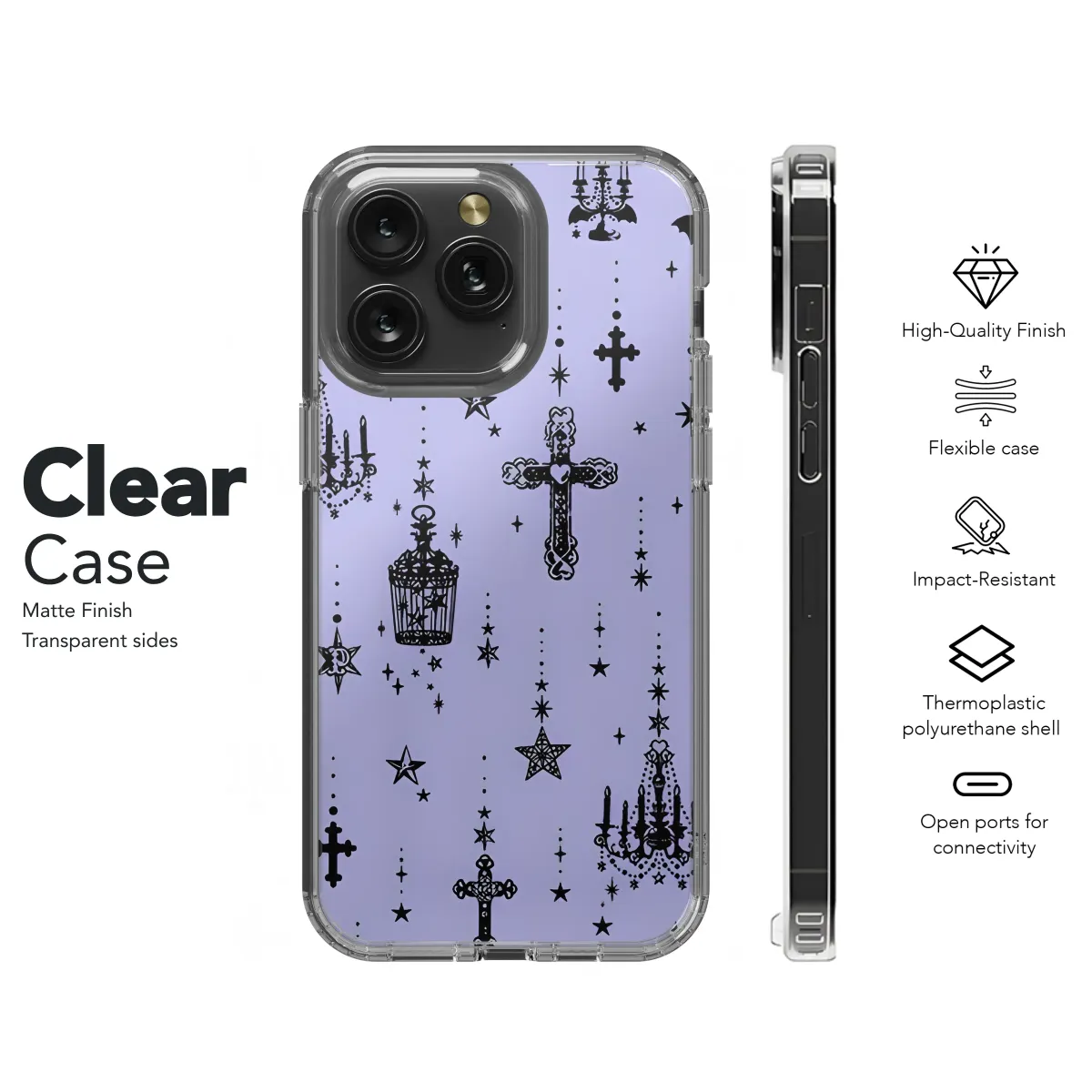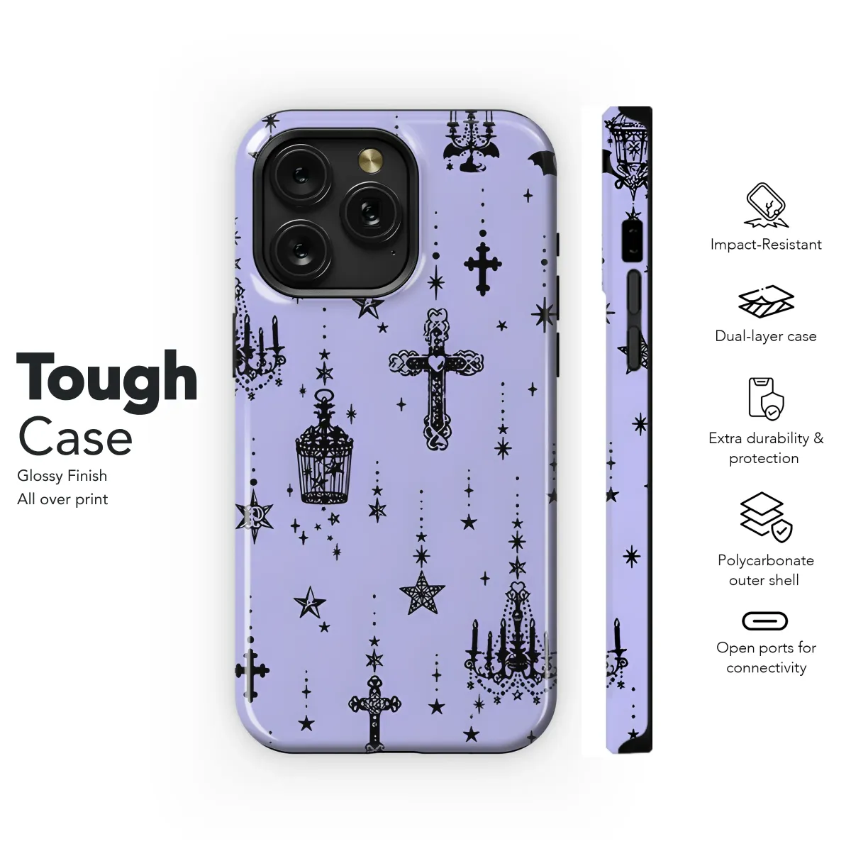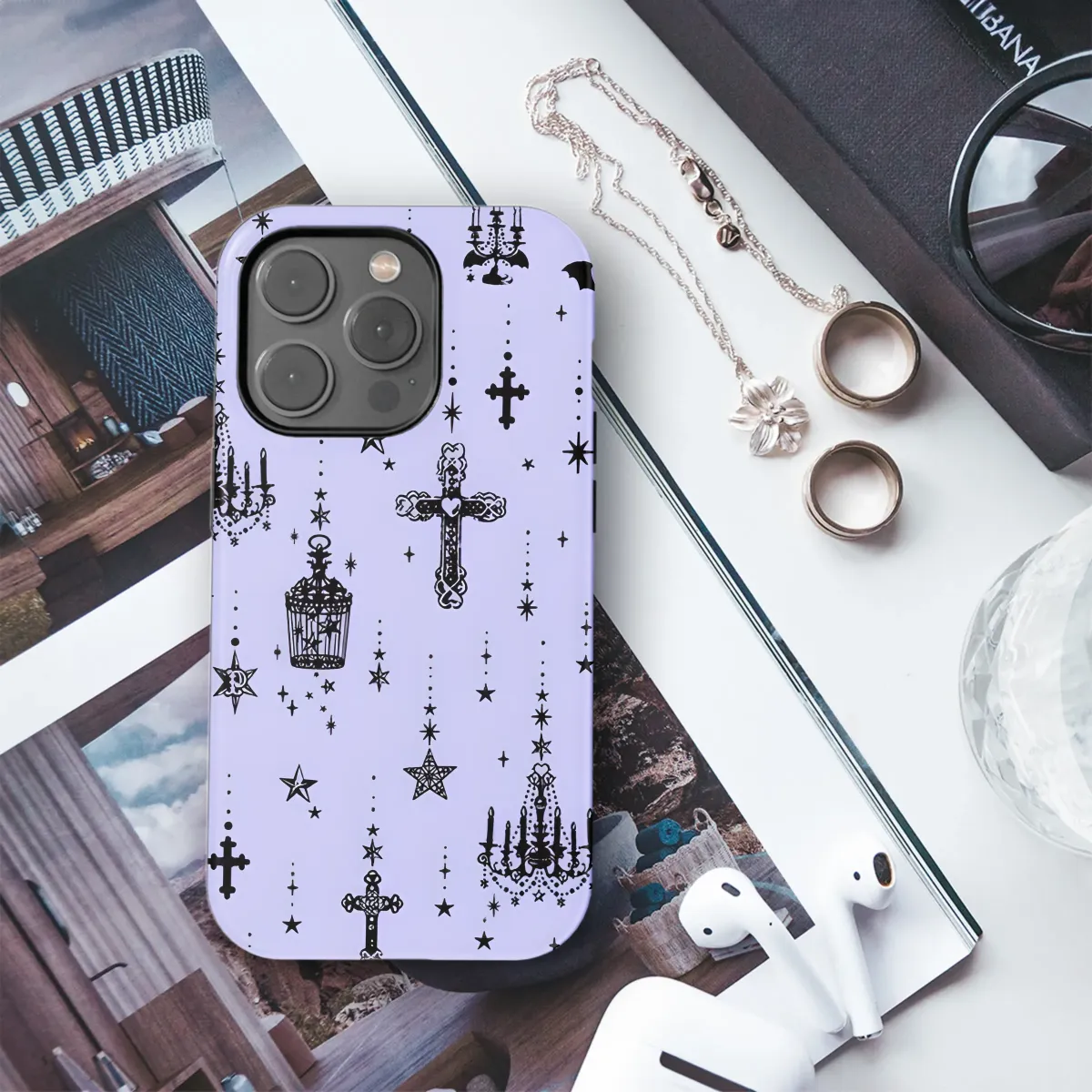 Embrace your mystical side with this enchanting design, featuring a captivating blend of celestial and gothic elements. Intricate crosses, elegant chandeliers, crescent moons, and charming birdcages dance amongst twinkling stars, creating a mesmerizing pattern that’s both darkly romantic and subtly whimsical. Perfect for adding a touch of gothic elegance or ethereal charm to your everyday style, this design is printed on high-quality material for a long-lasting and vibrant finish. The soft lavender background enhances the rich black detailing, resulting in a piece that's both stylish and sophisticated. This unique design offers a mystical aesthetic, ideal for those who appreciate the beautiful blend of darkness and light, making it the perfect accessory for expressing your individual style. Its detailed artwork and high-quality print ensures a stunning and long-lasting addition to your collection, sure to turn heads and spark conversations. This is more than just a protective layer; it's a statement of personal expression, combining artistry and practicality in a single, beautiful piece. Show off your unique personality with this captivating and unforgettable design.