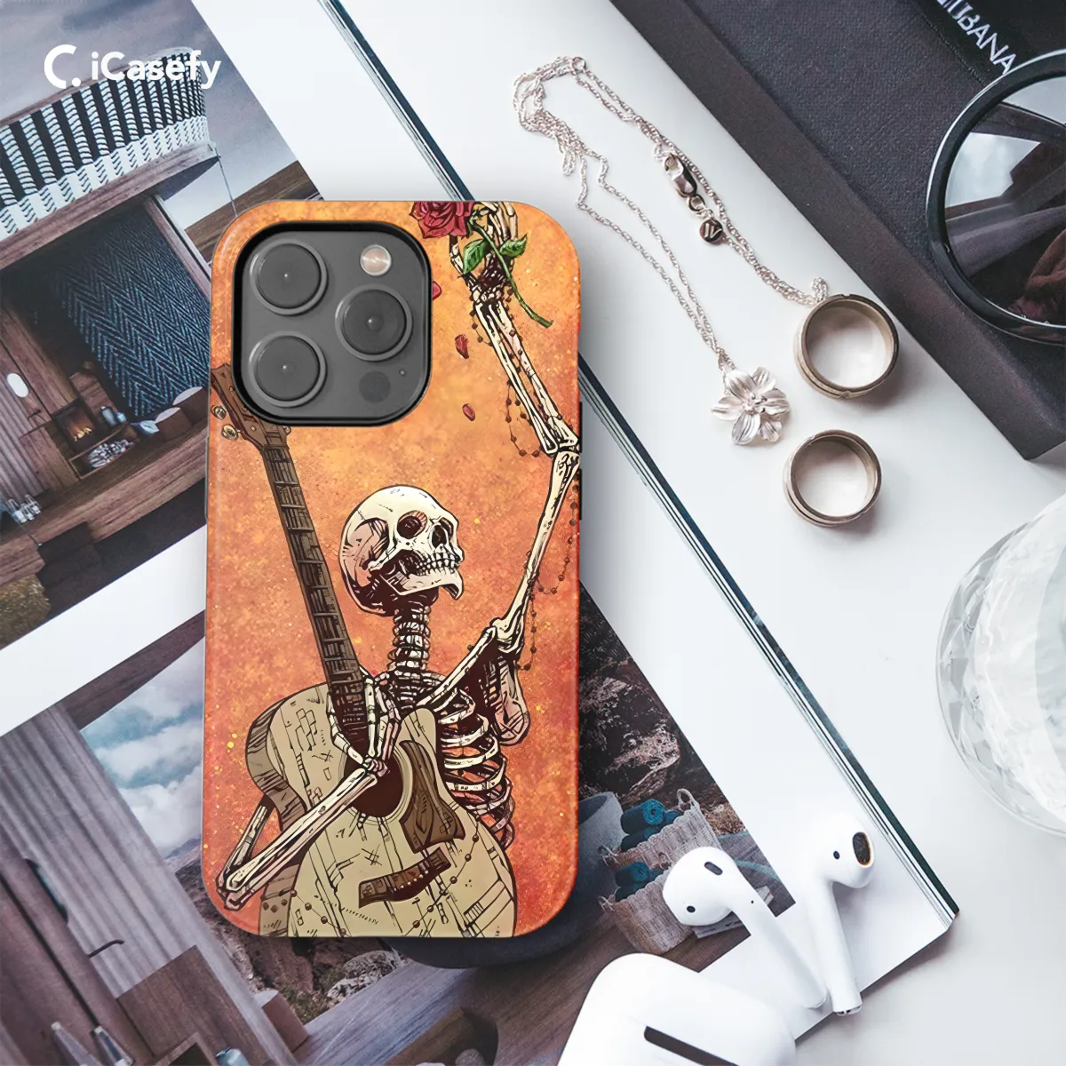 Adorn your phone with a touch of gothic charm with our Skeleton Red Rose Guitar Phone Case. This exquisite case features a captivating illustration of a skeletal guitarist serenade a vibrant red rose, exuding a unique blend of macabre and romantic. Crafted from durable materials, it safeguards your device from scratches and impacts while adding a touch of dark elegance to your style. Available for various iPhone, Samsung, and Pixel models, this case is the perfect accessory for those who embrace individuality and cherish the ethereal beauty of the macabre.