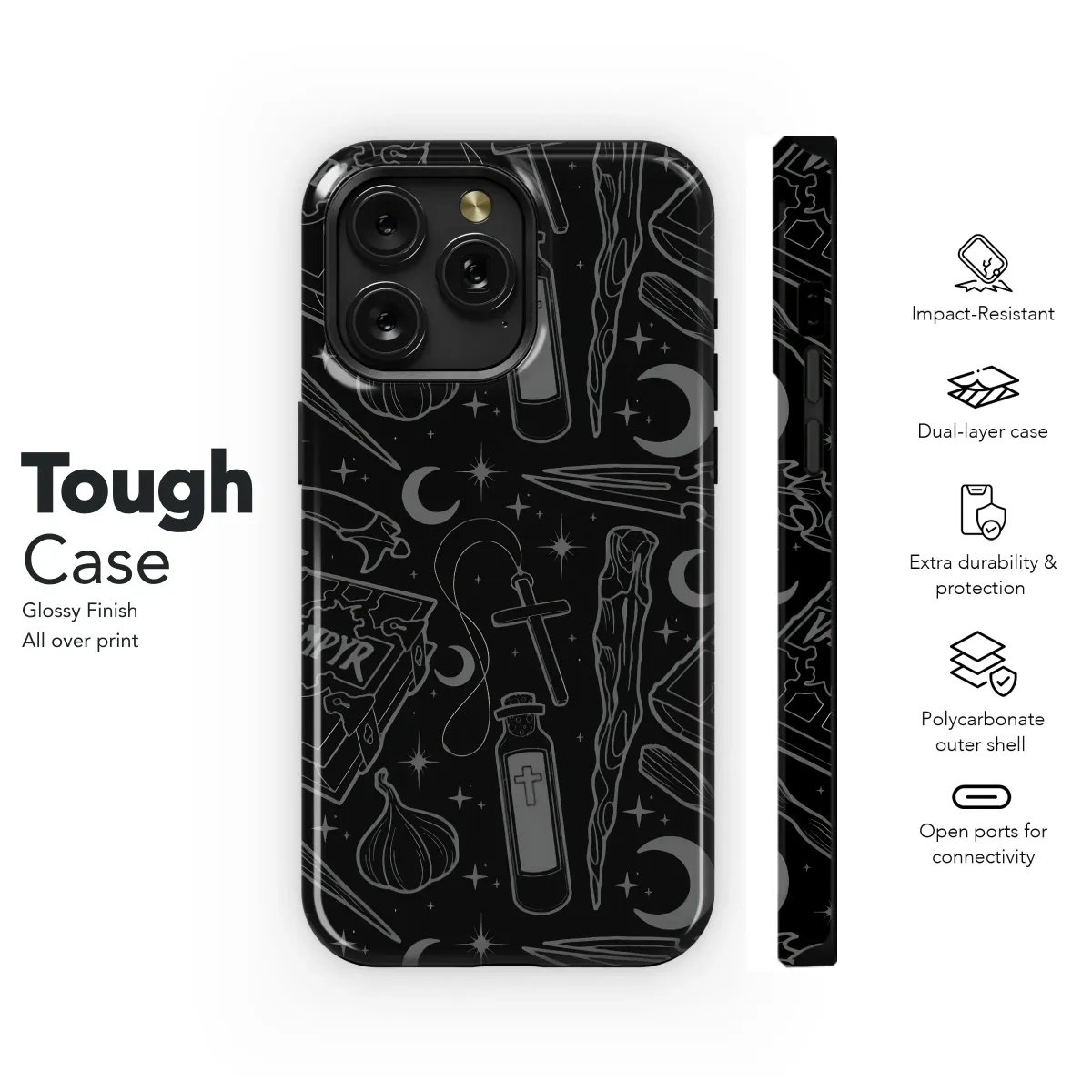 Embrace the night with this captivating gothic design, featuring a mesmerizing blend of mystical symbols and enchanting elements. This sleek, dark aesthetic showcases a repeating pattern of ancient books, holy symbols, mystical daggers, and crescent moons, all rendered in elegant grayscale for a sophisticated look. This mysterious and alluring print is perfect for adding a touch of gothic charm to your everyday life. The detailed linework creates a striking contrast against the black background, ensuring your style stands out from the crowd. Add a touch of the supernatural to your accessories with this unique and stylish design, a perfect blend of dark romanticism and timeless appeal. This high-quality print promises vibrant color and exceptional detail, guaranteed to last. Show off your unique personality with this eye-catching and unforgettable design. It's more than just a print; it's a statement. Express yourself with this alluring gothic accessory.