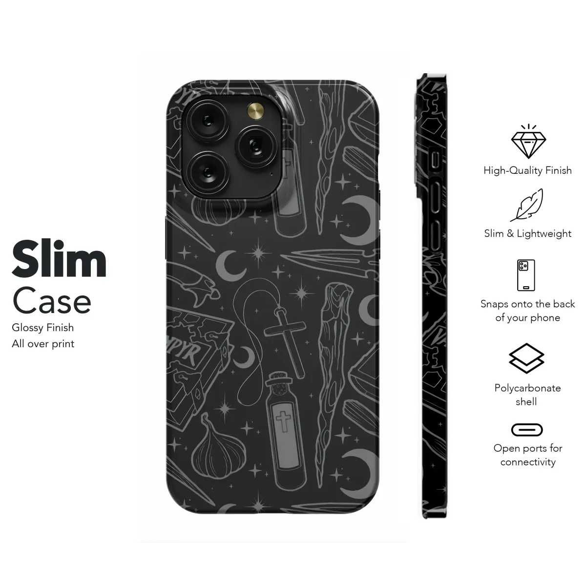 Embrace the night with this captivating gothic design, featuring a mesmerizing blend of mystical symbols and enchanting elements. This sleek, dark aesthetic showcases a repeating pattern of ancient books, holy symbols, mystical daggers, and crescent moons, all rendered in elegant grayscale for a sophisticated look. This mysterious and alluring print is perfect for adding a touch of gothic charm to your everyday life. The detailed linework creates a striking contrast against the black background, ensuring your style stands out from the crowd. Add a touch of the supernatural to your accessories with this unique and stylish design, a perfect blend of dark romanticism and timeless appeal. This high-quality print promises vibrant color and exceptional detail, guaranteed to last. Show off your unique personality with this eye-catching and unforgettable design. It's more than just a print; it's a statement. Express yourself with this alluring gothic accessory.