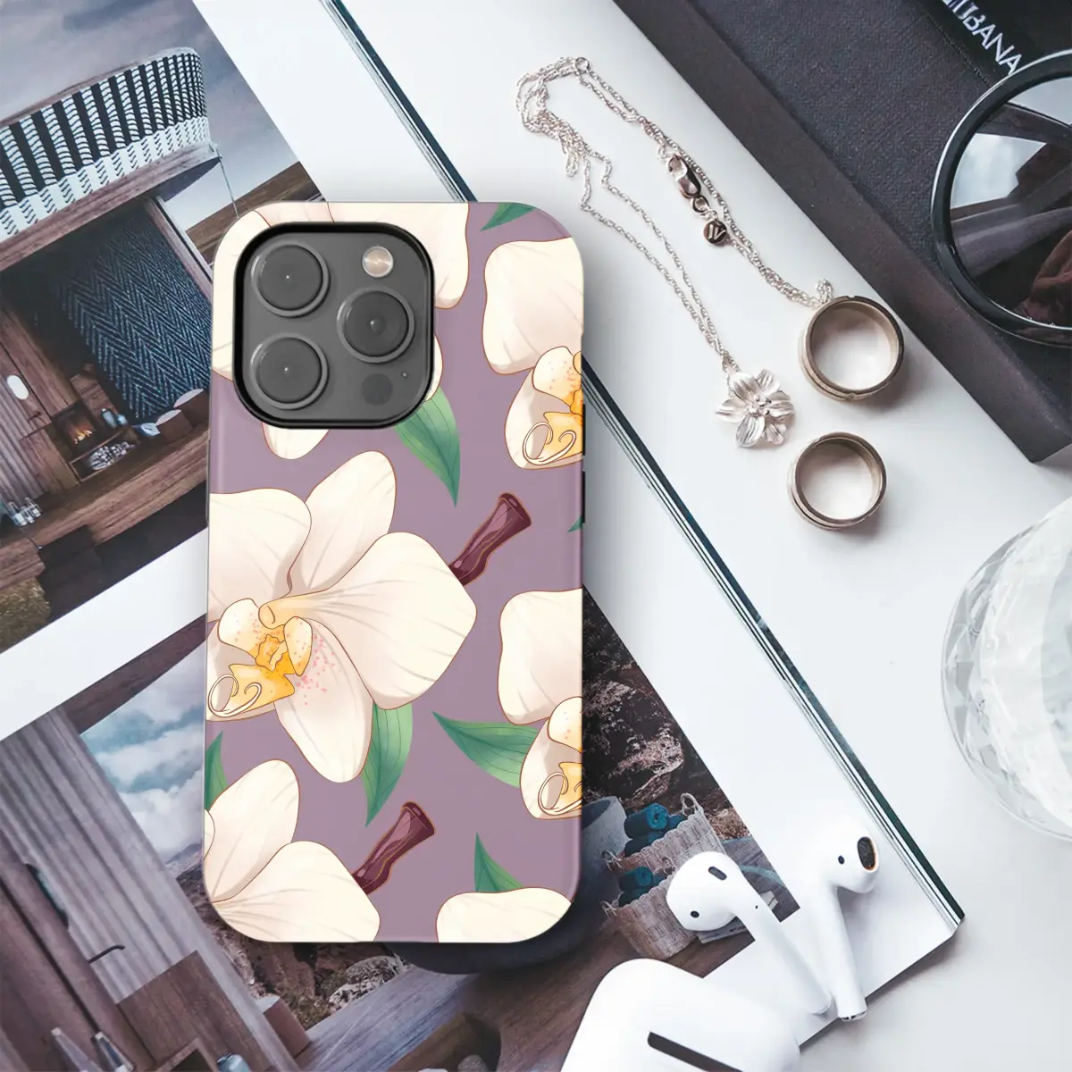 Immerse yourself in the quiet elegance of a twilight garden with this stunning botanical illustration, a design that whispers of grace and serenity. A cascade of luminous white orchids unfolds across a rich, dusky plum background, creating a captivating contrast that is both timeless and modern. Each petal is a work of art, rendered with exquisite detail—from the delicate, creamy veins that suggest a silken texture, to the soft, rose-gold speckles dusting the vibrant yellow heart of each bloom. This enchanting floral pattern evokes a profound sense of calm sophistication and natural beauty, making it the perfect way to carry a piece of nature's most delicate artistry with you. Dark green leaves peek from behind the blossoms, adding organic depth to the sophisticated composition. This design is an ideal accessory for anyone who adores a minimalist floral aesthetic, cottagecore vibes, or the unparalleled grace of the orchid flower. It’s more than just a pattern; it’s a wearable piece of art that transforms your everyday essential into a statement of refined personal style. Treat yourself or give a thoughtful gift to a friend, gardener, or anyone who appreciates the tranquil beauty of a secret garden captured in a single, elegant design.