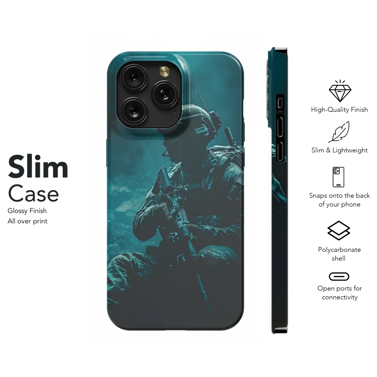 Elevate your style with this striking military-inspired design. Featuring a shadowy figure of a soldier, poised and ready, this graphic boasts a captivating teal color scheme that evokes a sense of mystery and power. Perfect for those who appreciate tactical aesthetics and bold statements, this design is printed using high-quality inks for vibrant, long-lasting color. Its sleek and sophisticated look is sure to turn heads, reflecting a strong personality and an appreciation for detail. This unique design transcends trends, offering a timeless piece that's as individual as you are. The high-resolution image ensures crisp details, adding depth and complexity to your accessory. Show your distinct style with this head-turning, durable, and eye-catching piece. Transform your everyday carry into a personalized statement with this captivating image that perfectly blends tactical elements with modern design sensibilities. Ideal for individuals seeking a powerful, subtle, yet striking aesthetic, this design is more than just an accessory; it's a reflection of your individuality. Search terms: military, soldier, tactical, army, camouflage, green, teal, shadow, gun, weapon, combat, action, stealth, mysterious, powerful, design, print.