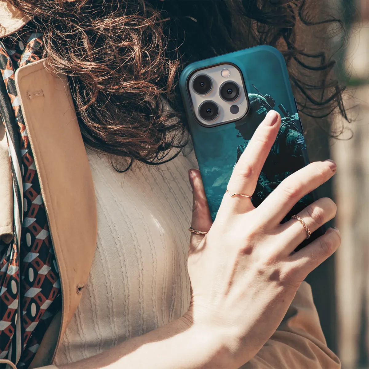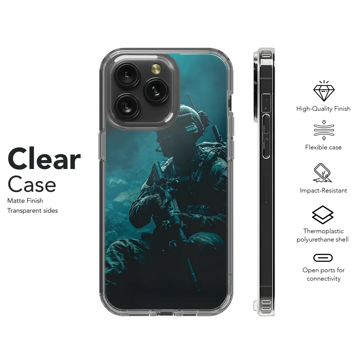 Elevate your style with this striking military-inspired design. Featuring a shadowy figure of a soldier, poised and ready, this graphic boasts a captivating teal color scheme that evokes a sense of mystery and power. Perfect for those who appreciate tactical aesthetics and bold statements, this design is printed using high-quality inks for vibrant, long-lasting color. Its sleek and sophisticated look is sure to turn heads, reflecting a strong personality and an appreciation for detail. This unique design transcends trends, offering a timeless piece that's as individual as you are. The high-resolution image ensures crisp details, adding depth and complexity to your accessory. Show your distinct style with this head-turning, durable, and eye-catching piece. Transform your everyday carry into a personalized statement with this captivating image that perfectly blends tactical elements with modern design sensibilities. Ideal for individuals seeking a powerful, subtle, yet striking aesthetic, this design is more than just an accessory; it's a reflection of your individuality. Search terms: military, soldier, tactical, army, camouflage, green, teal, shadow, gun, weapon, combat, action, stealth, mysterious, powerful, design, print.