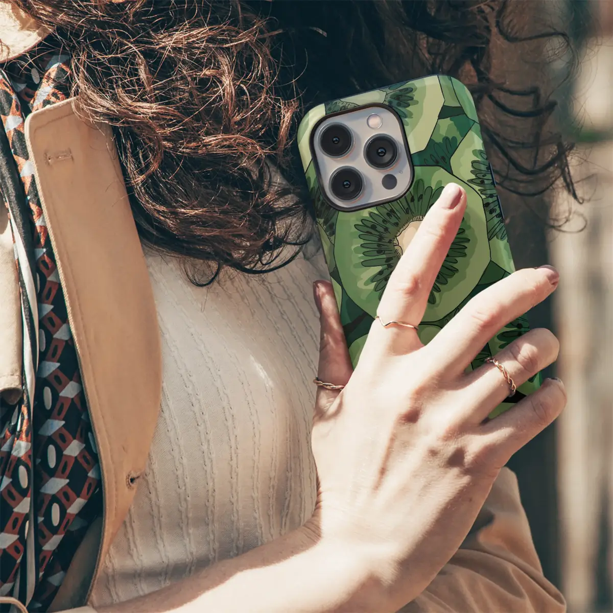Embrace a fresh and vibrant style with this eye-catching kiwi fruit pattern. The design features a delightful collage of sliced kiwis, rendered in a beautiful palette of lush greens from soft sage to deep emerald. Detailed with artistic black outlines and seeds, this illustrated print captures the juicy, tropical essence of summer, making it a cheerful and trendy accessory for any fruit lover.