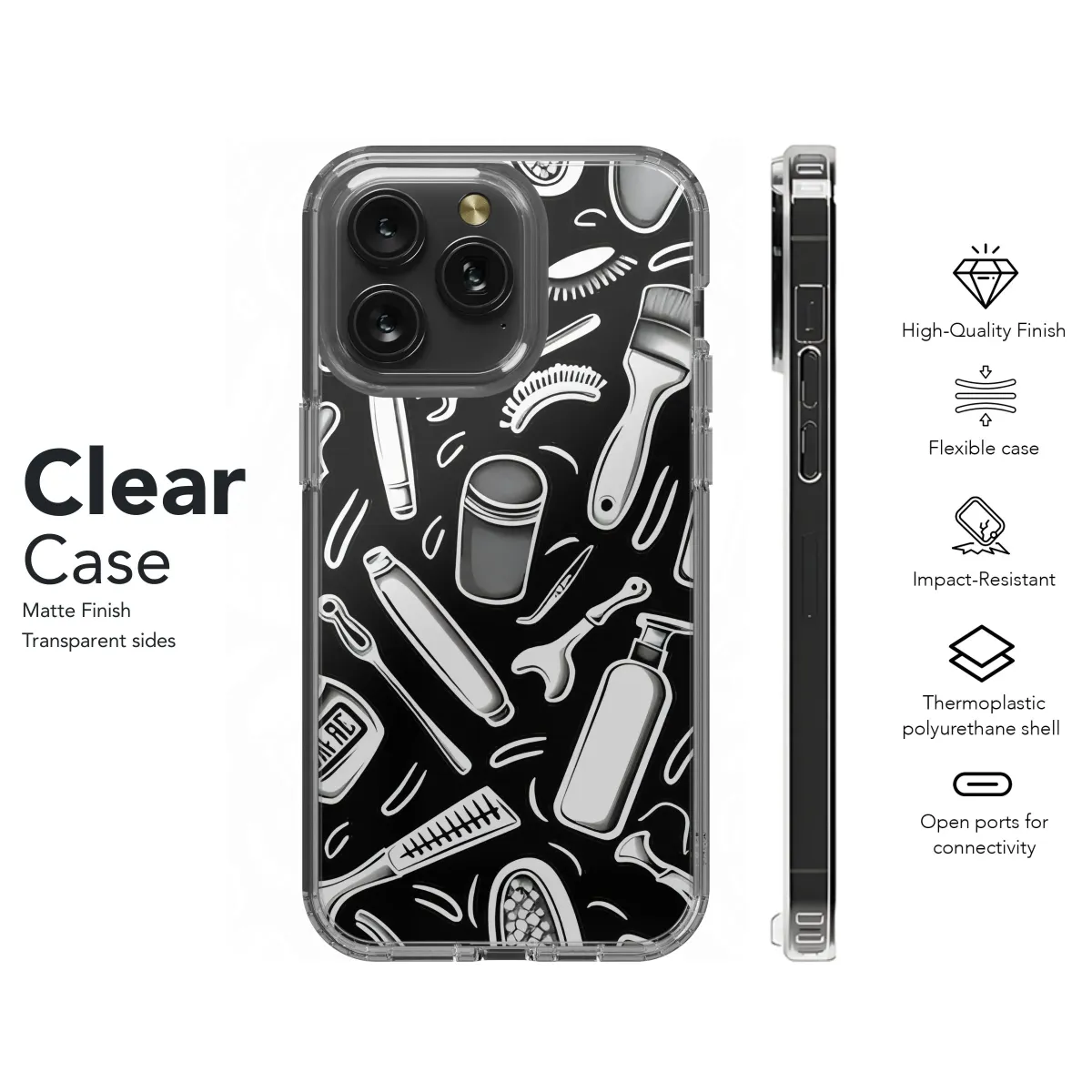 Adorn your device with this stylish and monochromatic design featuring a playful pattern of beauty and grooming essentials. This striking black and white graphic presents a unique collection of combs, brushes, lotions, and potions, arranged in a captivating, modern aesthetic. Perfect for the skincare enthusiast, makeup lover, or anyone who appreciates a touch of self-care inspiration, this design brings a sophisticated and artistic flair to your everyday tech. Express your personality and love for all things beauty with this eye-catching pattern. Get yours today and showcase your passion for personal care, grooming accessories, beauty products, monochrome art, self-care gifts, skincare design, makeup pattern, beauty illustration.