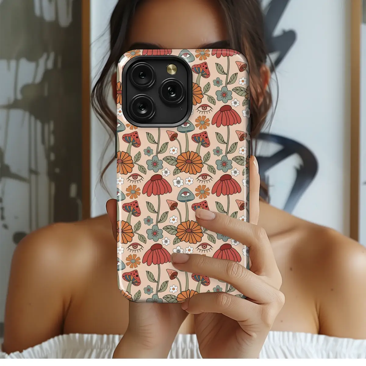 Channel your inner flower child and get lost in a groovy, enchanted garden every time you reach for your daily essential. This whimsical 70s-inspired design is a tapestry of pure retro magic, perfect for the bohemian soul with a love for all things funky and floral. Wise, all-seeing mushrooms in dusty teal and terracotta stand tall amongst blooming retro flowers, their caps adorned with watchful eyes that add a touch of mystical, evil eye protection to your vibe. Floating between the groovy orange and blue blossoms, these cosmic guardians are scattered throughout a field of cheerful daisies, all set against a warm, peachy-cream backdrop. It's a vibrant, psychedelic dreamscape rendered in an earthy palette of burnt orange, sage green, and vintage red. This isn't just an accessory; it's a piece of wearable art, a personal talisman that infuses your tech with indie aesthetic and cottagecore charm. Let this trippy, botanical pattern be a constant reminder to stay curious and embrace the magic in the mundane, making it the perfect unique gift for her or a groovy treat for yourself. Wrap your world in a little bit of seventies soul and let your free spirit shine.