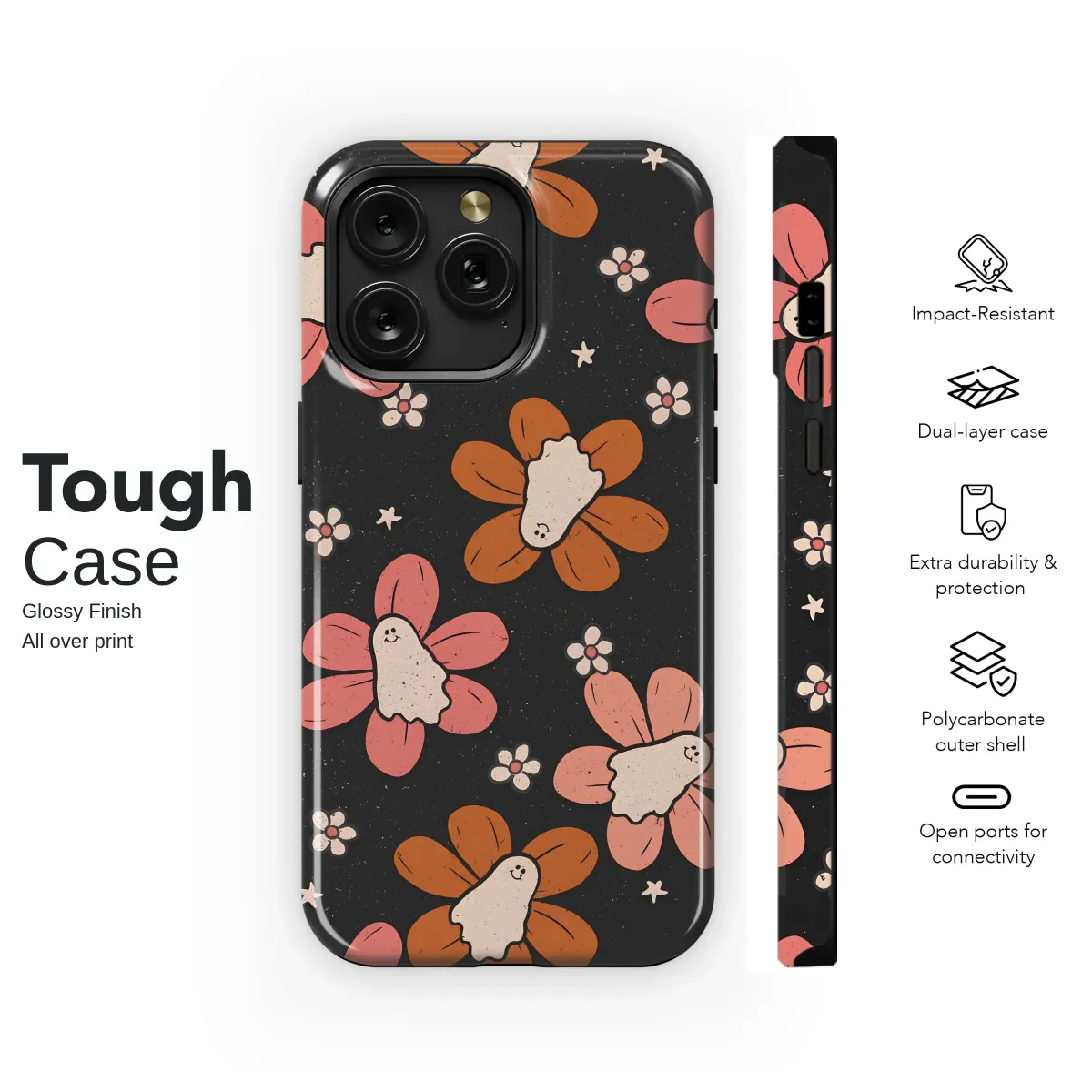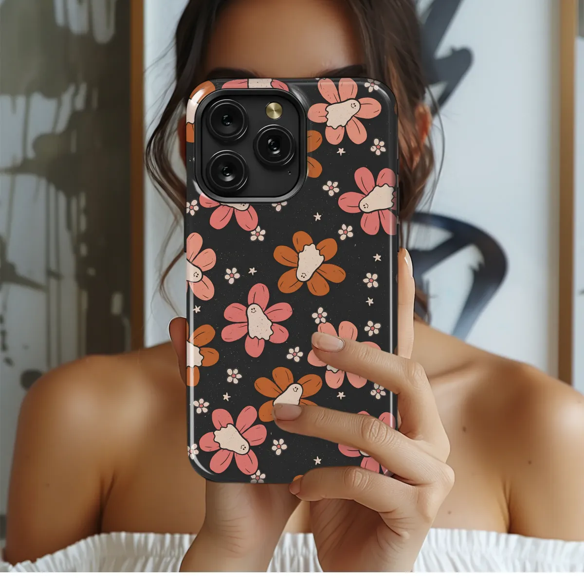 Step into a whimsical world where groovy meets ghostly with this enchanting design, a perfect fusion of retro vibes and playful spookiness. Set against a deep, textured charcoal background reminiscent of a starry night, a field of stylized flowers blooms in a dreamy palette of dusty rose, apricot, and burnt orange. This isn't just any floral pattern; look closer and you'll find a friendly little ghost nestled in the heart of each blossom, peeking out with a sweet, knowing smile. This captivating artwork perfectly blends the free-spirited energy of 70s flower power with a quirky, supernatural twist, creating a truly unique aesthetic. The vintage-inspired texture and warm, earthy color palette evoke a sense of cozy nostalgia, making it the ideal choice for anyone who adores boho chic, retro flair, and a touch of the whimsically weird. Imagine carrying a piece of this charming universe with you, a design that sparks joy and curiosity wherever you go. Let this unique artwork wrap your most-used essential in a story of playful spirits and blooming botanicals, transforming it from a simple object into a conversation-starting piece of art that showcases your wonderfully eclectic personality. It’s a year-round celebration of spooky-cute charm and timeless floral beauty.