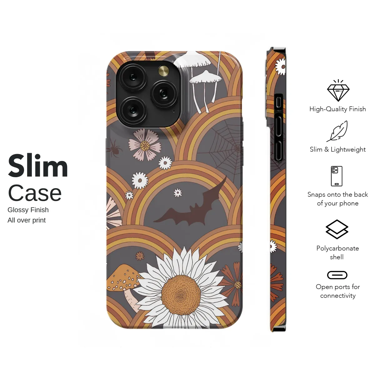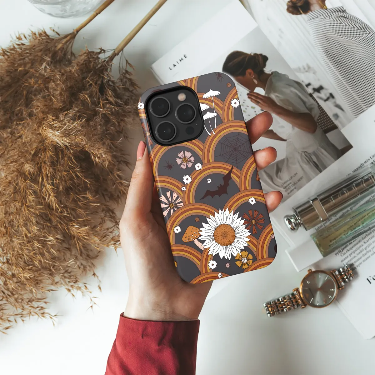 Embrace your unique spirit with this enchanting artwork, a portal to a world where groovy 70s nostalgia meets whimsical gothic charm. Lose yourself in a mystical twilight meadow, where arches of warm, earthy rainbows create a dreamscape against a deep charcoal sky. This captivating pattern is a rich tapestry of nature's magic and retro vibes, perfect for the modern bohemian with a love for all things spooky. Discover hand-drawn sunflowers and daisies blooming alongside curious mushrooms, while silent crows, fluttering bats, and glistening spiderwebs add a touch of delightful mystery. The autumnal color palette of burnt orange, mustard yellow, and rich browns evokes the cozy feeling of a crisp fall day, making it an ideal accessory for the season and beyond. This design is more than just a beautiful illustration; it's an expression of individuality for lovers of goblincore, dark cottagecore, and unique vintage aesthetics. Let this piece adorn your favorite accessory, adding a touch of personal magic and intricate artistry to your everyday carry. It's a statement of style, a nod to the past, and a celebration of the beautifully strange.