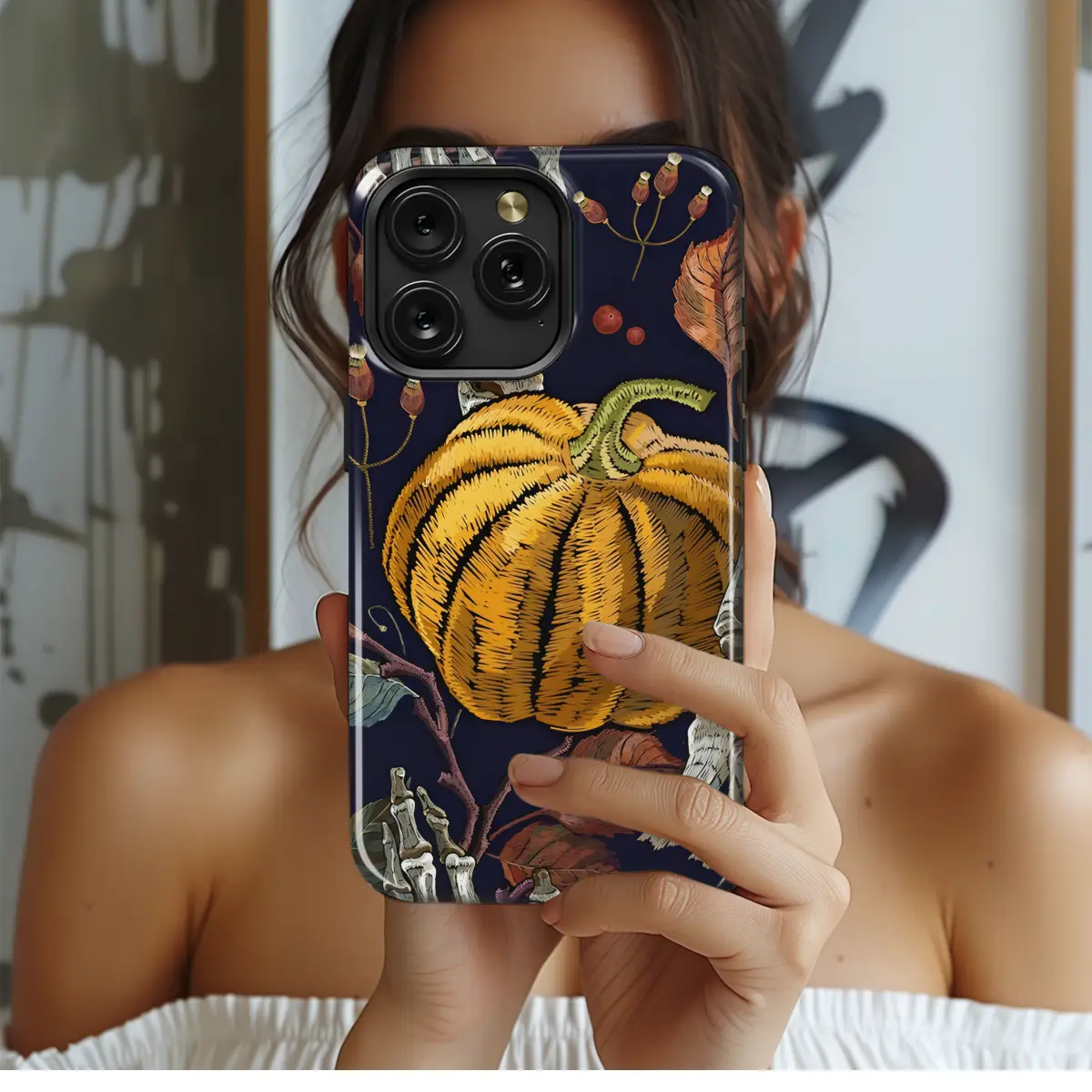 Celebrate the spooky season with our captivating phone case, adorned with an intricate embroidery of pumpkins, autumn leaves, and skeletal hands. This hauntingly beautiful design brings the spirit of Halloween right to your fingertips. Its vibrant hues and meticulous craftsmanship will cast a spell on all who behold it. Protect your precious device with style and let the magic of autumn embrace you every time you use your phone.