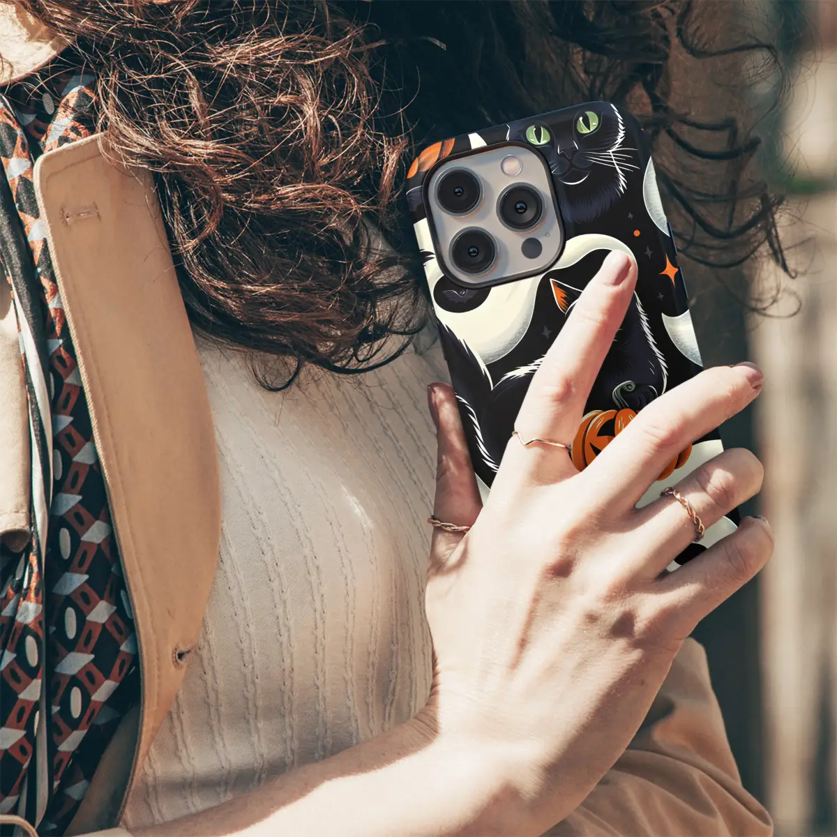 Introducing the ultimate Halloween accessory for your smartphone—our phone case featuring a spooky blend of black cats, pumpkins, and ghosts. This case is designed to protect your phone from bumps and scratches while adding a touch of eerie charm to your device. Whether you're using an iPhone, Samsung, or Pixel, we've got you covered. Its durable construction ensures long-lasting protection, and the vibrant print will keep your phone looking frightfully fashionable. Embrace the spirit of Halloween with our stylish and spine-tingling phone case.