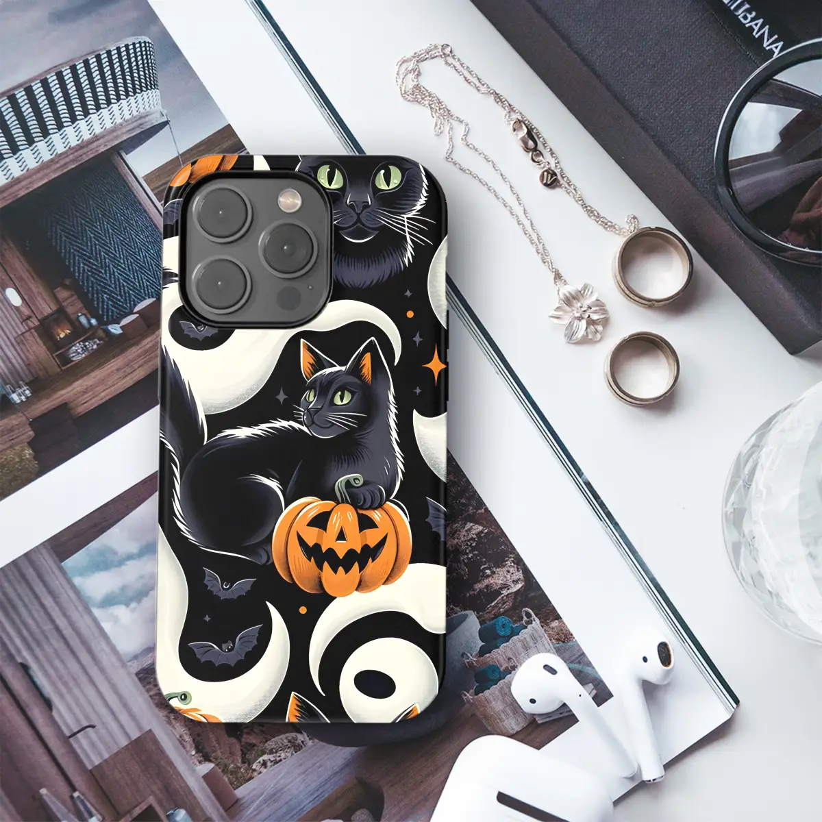 Introducing the ultimate Halloween accessory for your smartphone—our phone case featuring a spooky blend of black cats, pumpkins, and ghosts. This case is designed to protect your phone from bumps and scratches while adding a touch of eerie charm to your device. Whether you're using an iPhone, Samsung, or Pixel, we've got you covered. Its durable construction ensures long-lasting protection, and the vibrant print will keep your phone looking frightfully fashionable. Embrace the spirit of Halloween with our stylish and spine-tingling phone case.