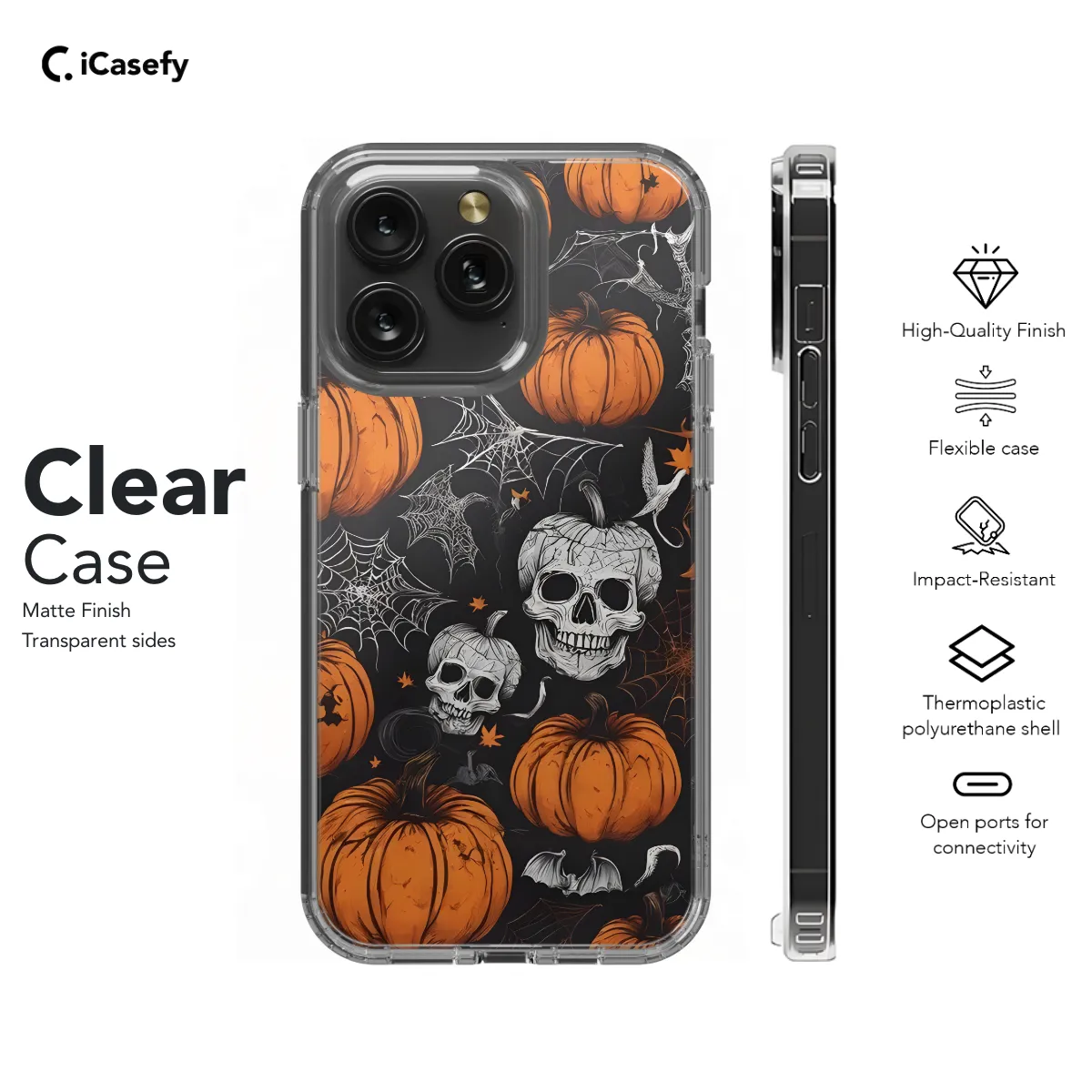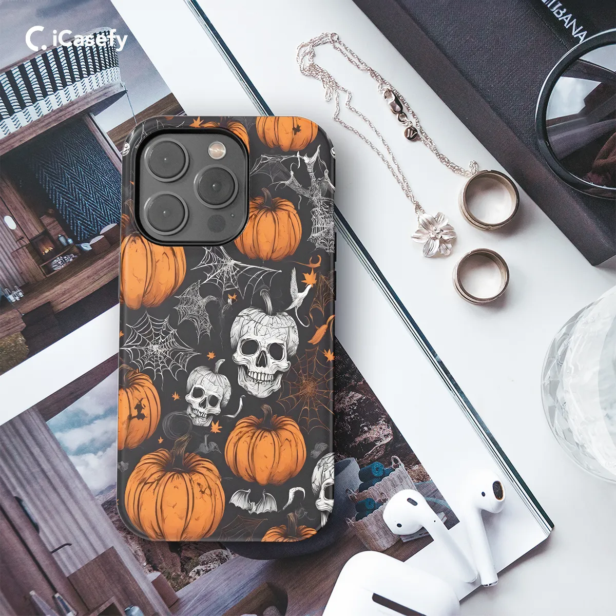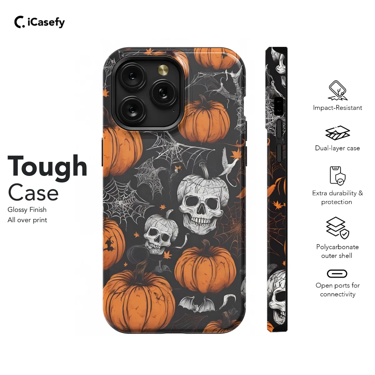 Embrace the spooky season with our Halloween-themed phone case! Adorned with intricate spider webs, mischievous bats, and haunting skeletons, this case exudes the essence of All Hallows' Eve. The festive pumpkin print adds a touch of whimsy and warmth, setting the perfect tone for your autumnal adventures. Protect your precious device while immersing it in the spirit of Halloween with this enchanting case.