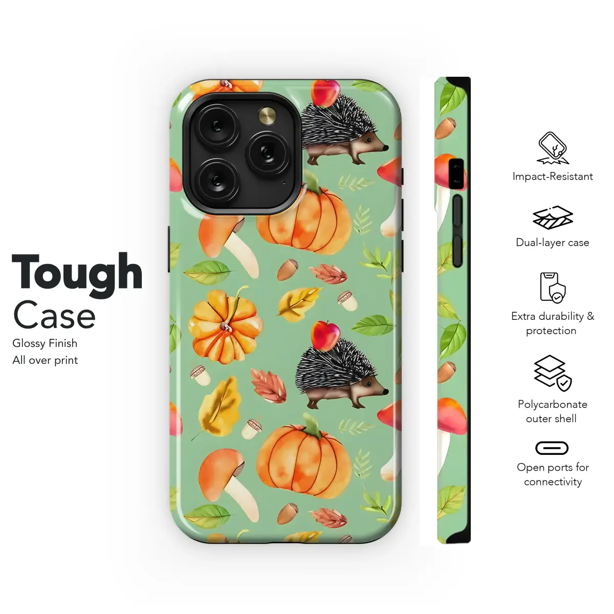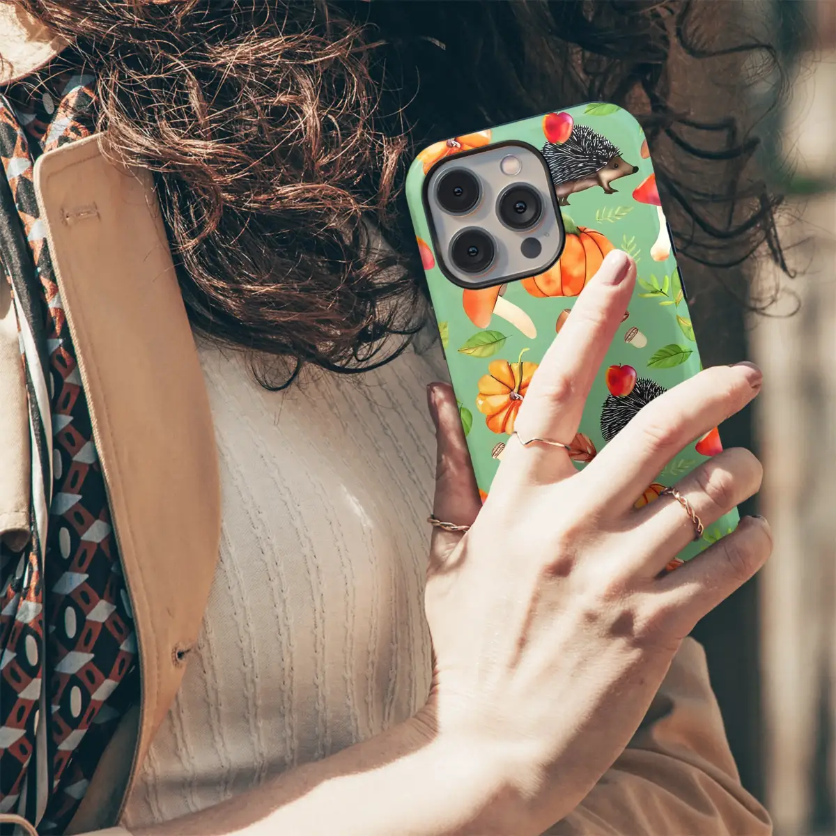 Embrace the cozy magic of the season with this enchanting woodland art cover, designed to bring a touch of autumn whimsy to your most essential daily device. This unique and durable tech accessory features a beautifully detailed watercolor pattern, capturing the heart of a crisp fall day in a stunning visual narrative. Watch as utterly charming hedgehogs, each carrying a shiny red apple on their back, scurry amongst plump orange pumpkins, rustic toadstools, and scattered acorns. The warm, earthy tones of the fall leaves in shades of gold, rust, and yellow stand out vibrantly against the serene mint green backdrop, creating a truly eye-catching botanical design that feels both fresh and nostalgic. Perfect for lovers of cottagecore aesthetics, forest creatures, and all things cozy, this slim and lightweight artistic shell provides stylish protection without adding unnecessary bulk. It’s a second skin for your gadget that guards against everyday bumps and scratches while showcasing your unique personality and love for nature. This charming animal print is a wonderful way to carry a piece of the serene woods with you wherever you venture. It makes an ideal gift for her, a thoughtful back-to-school present for a student, or a perfect treat for any nature enthusiast looking to celebrate the autumn harvest season. Wrap your technology in the beauty of the forest and keep the spirit of fall at your fingertips.