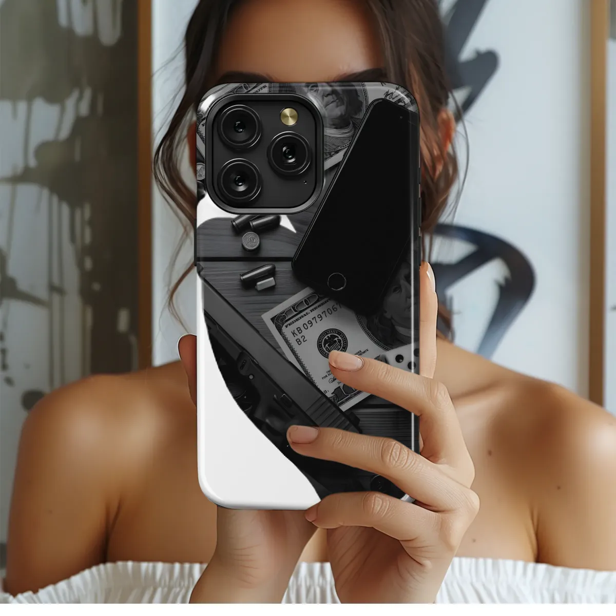This striking design features a high-contrast monochrome aesthetic, capturing the essence of high-stakes risk and reward. The image blends elements of wealth – crisp hundred-dollar bills – with symbols of danger – a handgun and ammunition – creating a powerful visual narrative. A sleek, modern device lies centrally, subtly hinting at the constant connectivity of our times, while a die adds a touch of chance and uncertainty. The overall effect is a sophisticated yet edgy graphic, perfect for those who appreciate bold style and a touch of the dramatic. This design is printed with high-quality inks to ensure vibrant colors and long-lasting durability. It's an ideal choice for anyone seeking a unique and unforgettable accessory that reflects their individual personality. The minimalist grayscale palette ensures versatility, complementing any outfit or personal style. Elevate your look with this eye-catching, conversation-starting design.