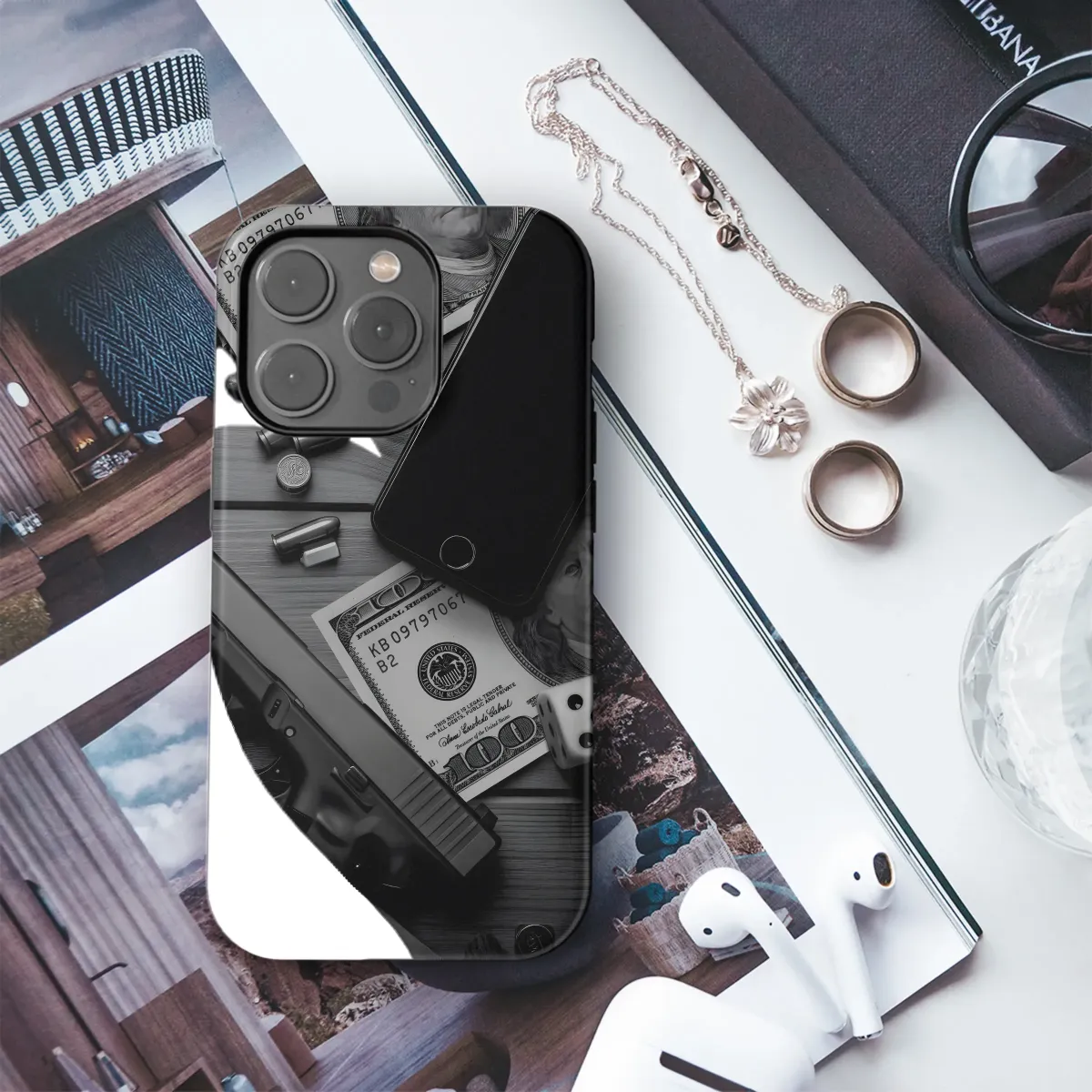 This striking design features a high-contrast monochrome aesthetic, capturing the essence of high-stakes risk and reward. The image blends elements of wealth – crisp hundred-dollar bills – with symbols of danger – a handgun and ammunition – creating a powerful visual narrative. A sleek, modern device lies centrally, subtly hinting at the constant connectivity of our times, while a die adds a touch of chance and uncertainty. The overall effect is a sophisticated yet edgy graphic, perfect for those who appreciate bold style and a touch of the dramatic. This design is printed with high-quality inks to ensure vibrant colors and long-lasting durability. It's an ideal choice for anyone seeking a unique and unforgettable accessory that reflects their individual personality. The minimalist grayscale palette ensures versatility, complementing any outfit or personal style. Elevate your look with this eye-catching, conversation-starting design.