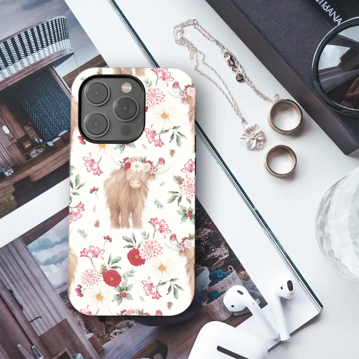 Step into a whimsical winter wonderland every time you reach for your daily companion! This enchanting design wraps your most essential tech in a heartwarming story of countryside friendship and festive cheer. Gaze upon the impossibly fluffy Highland cow, a gentle giant from the Scottish glens, looking utterly serene beneath a beautiful Christmas floral crown. A tiny, cheerful robin has come to visit, perching delicately on its horn, as if sharing a secret of the woods. This stunning watercolor scene is a true celebration of the season, scattered with lush clusters of rich crimson and snowy white dahlias, sprigs of classic holly with ruby-red berries, and tiny, rustic pinecones that seem to evoke the crisp scent of a winter forest stroll. The detailed, painterly artistry brings this cottagecore dream to life, transforming a simple necessity into a piece of wearable art. Perfect for the nature lover with a boho soul, this durable and stylish armor adds a touch of rustic farmhouse charm to your everyday routine. Let this adorable coo and his feathered friend guard your connection to the world with unparalleled sweetness, making it the most thoughtful and unique Christmas gift for her, a best friend, or a cozy seasonal treat just for you.