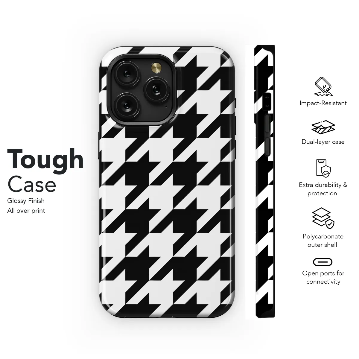 Stay on-trend with our stylish Houndstooth Black White Phone Case, designed to protect your iPhone, Samsung, or Pixel phone in style. This slim and lightweight case features a classic houndstooth pattern in black and white, adding a touch of sophistication to your device. Its durable material offers reliable protection against scratches, bumps, and everyday wear and tear. Keep your phone protected while making a fashion statement with this chic and practical phone case.