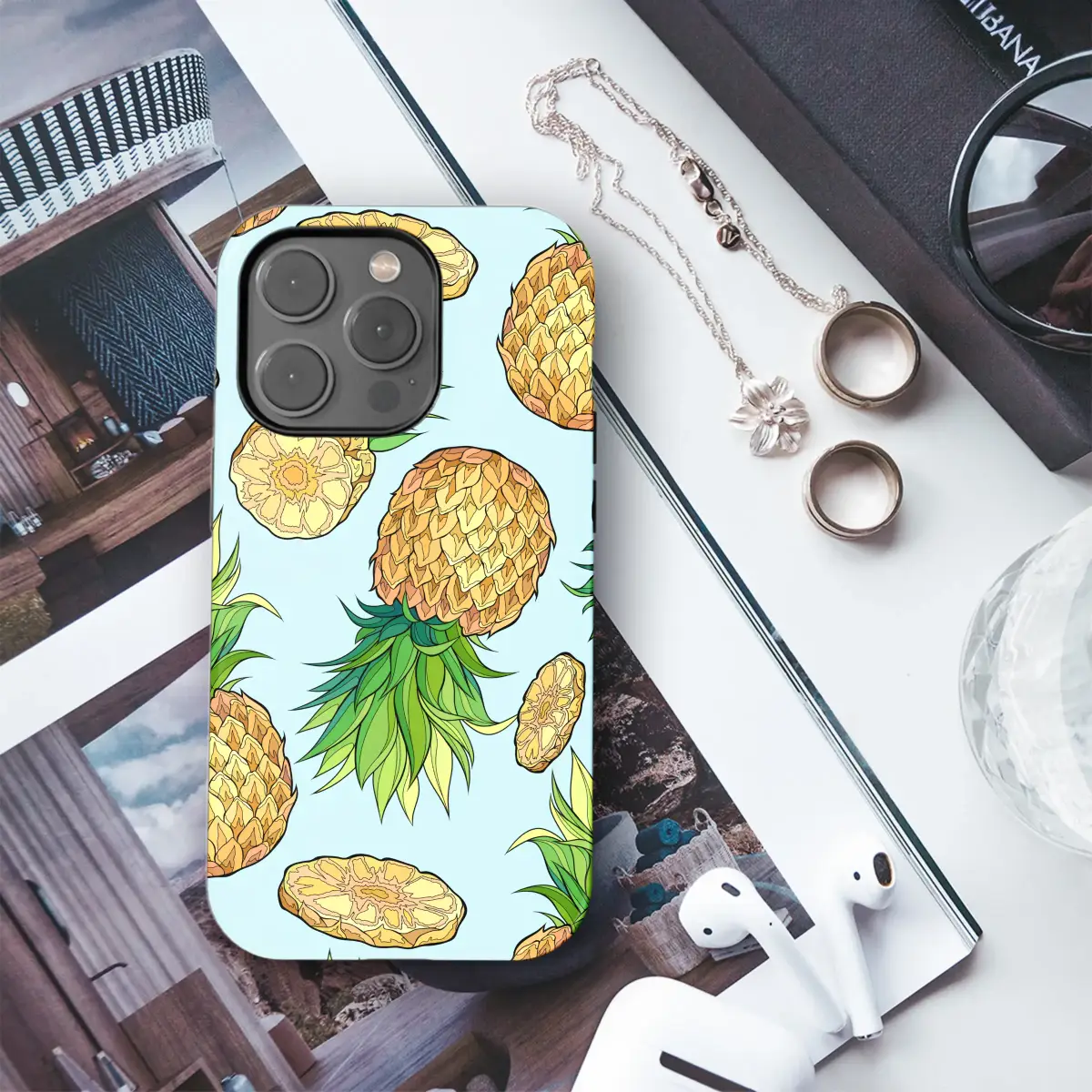 Add a splash of tropical fun to your everyday with this vibrant pineapple pattern phone case. Featuring a cheerful, hand-drawn design of whole and sliced pineapples on a light blue background, this cover brings a sunny, vacation-ready feel to your device. Inspired by warm beach days and sweet summer fruits, this design is perfect for anyone who loves bright colors and playful patterns. It’s a small piece of paradise you can carry with you everywhere. Key Features: • Durable Protection: Made from a hybrid Thermoplastic Polyurethane (TPU) and Polycarbonate (PC) material to guard against scratches, dust, and minor drops. • Vivid, Lasting Print: The design is UV printed for a vibrant, long-lasting finish that resists fading and chipping. • Slim & Lightweight: Offers solid protection without adding bulk, maintaining your phone's sleek profile. • Precise Cutouts: Ensures easy access to all ports, buttons, and camera functions. Available for a wide range of iPhone, Samsung Galaxy, and Google Pixel models. Select your device from the dropdown menu.