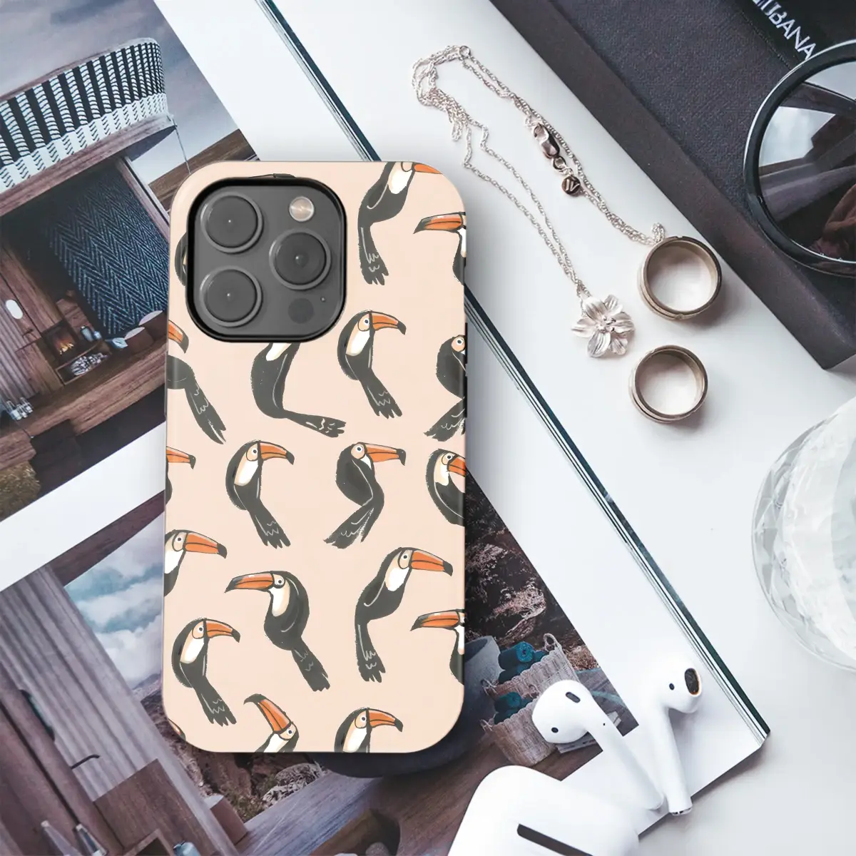 Adorn your accessory with a touch of the tropics. This charming design showcases a playful, repeating pattern of illustrated toucans set against a soft, blush pink background. The artistic, brush-stroke quality lends a unique, hand-painted feel, making it a vibrant and cheerful statement for any animal or nature enthusiast.