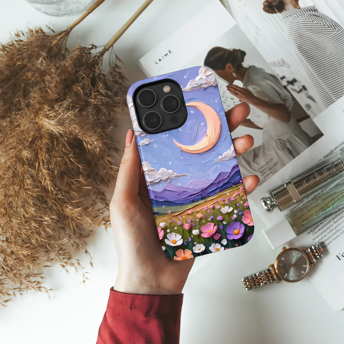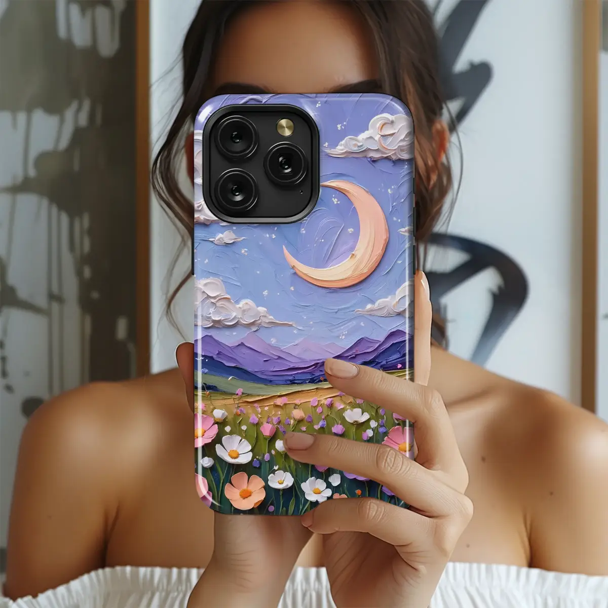Immerse yourself in a dreamy landscape with this textured impasto art design. Featuring a serene crescent moon hanging in a lavender night sky above rolling purple mountains, the scene is brought to life with a vibrant meadow of colorful wildflowers. The thick, painterly strokes create a captivating 3D effect, making this a unique piece of whimsical art.