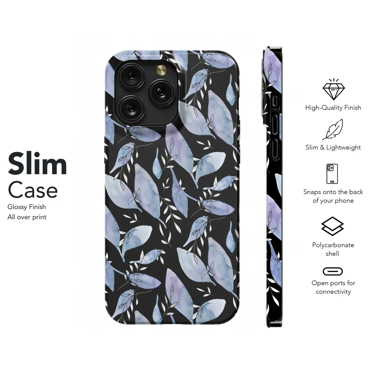 Immerse yourself in the serene beauty of our 'Twilight Bloom' design, a captivating watercolor leaf pattern on a sleek, black background. This unique artwork features delicate, hand-painted foliage in soothing shades of blue and lavender, accented by minimalist white sprigs. The seamless repeat creates a visually stunning effect, perfect for adding a touch of nature-inspired elegance to your everyday essentials. Ideal for lovers of botanical art, floral patterns, and modern aesthetics, this versatile design offers a stylish way to personalize your must-have tech accessory. Elevate your device with this chic, trendy illustration that captures the essence of watercolor artistry and brings a calming, sophisticated vibe to your mobile companion. Explore our collection of artistic covers and discover the perfect pattern to express your unique style! Get yours today and make a statement with this beautiful, eye-catching watercolor print.
