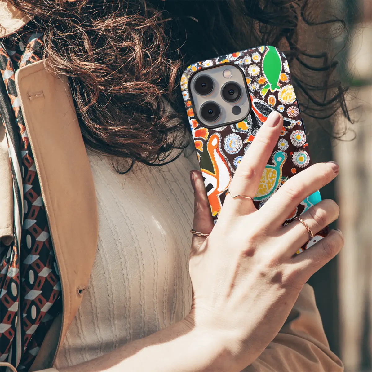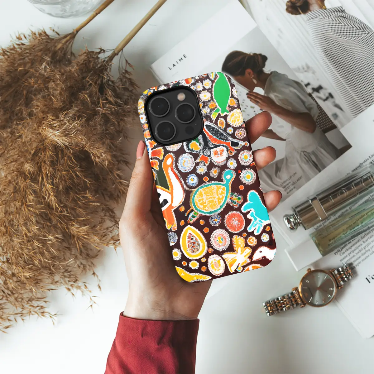 Embrace the vibrant Aboriginal heritage with this captivating phone case. Its intricate painting showcases an array of animals and dots, evoking the ancient art form of the Indigenous people of Australia. Each phone case is a unique piece of art, bringing a touch of cultural richness to your smartphone. Protect your device with style and celebrate the beauty of Aboriginal culture.