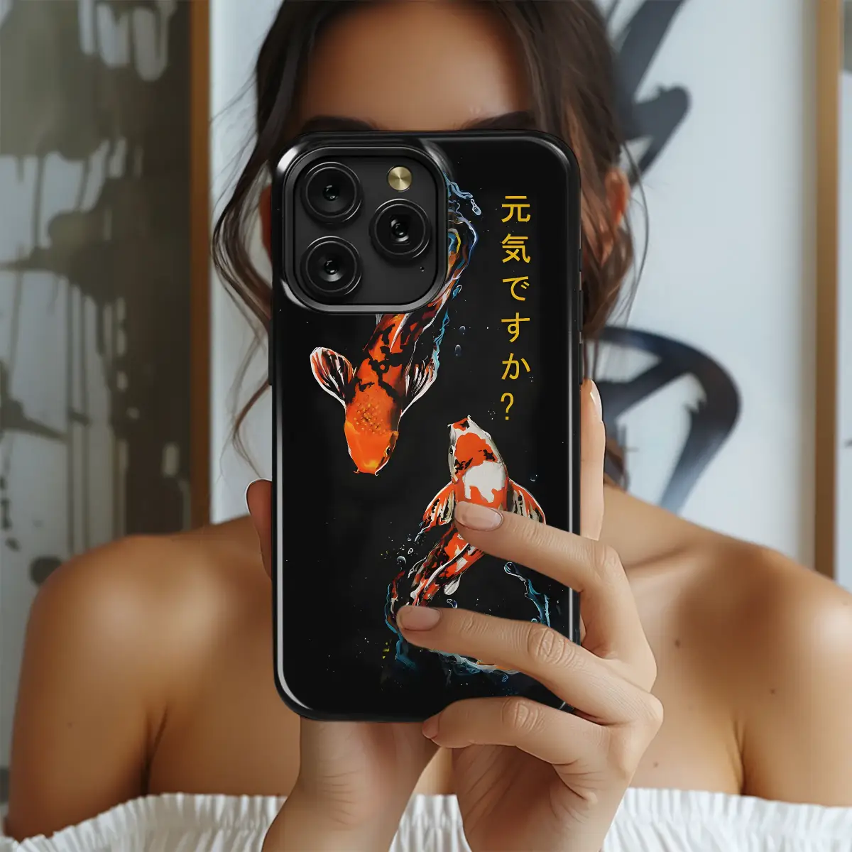 Showcase your love for Japanese art with this dynamic koi fish design. This striking piece features two vibrant orange, black, and white koi swimming through abstract water splashes against a deep black background. The design is complemented by the Japanese phrase '元気ですか?' (Genki desu ka?), meaning 'How are you?', rendered in elegant yellow script, adding a layer of authentic cultural expression and artistic flair.
