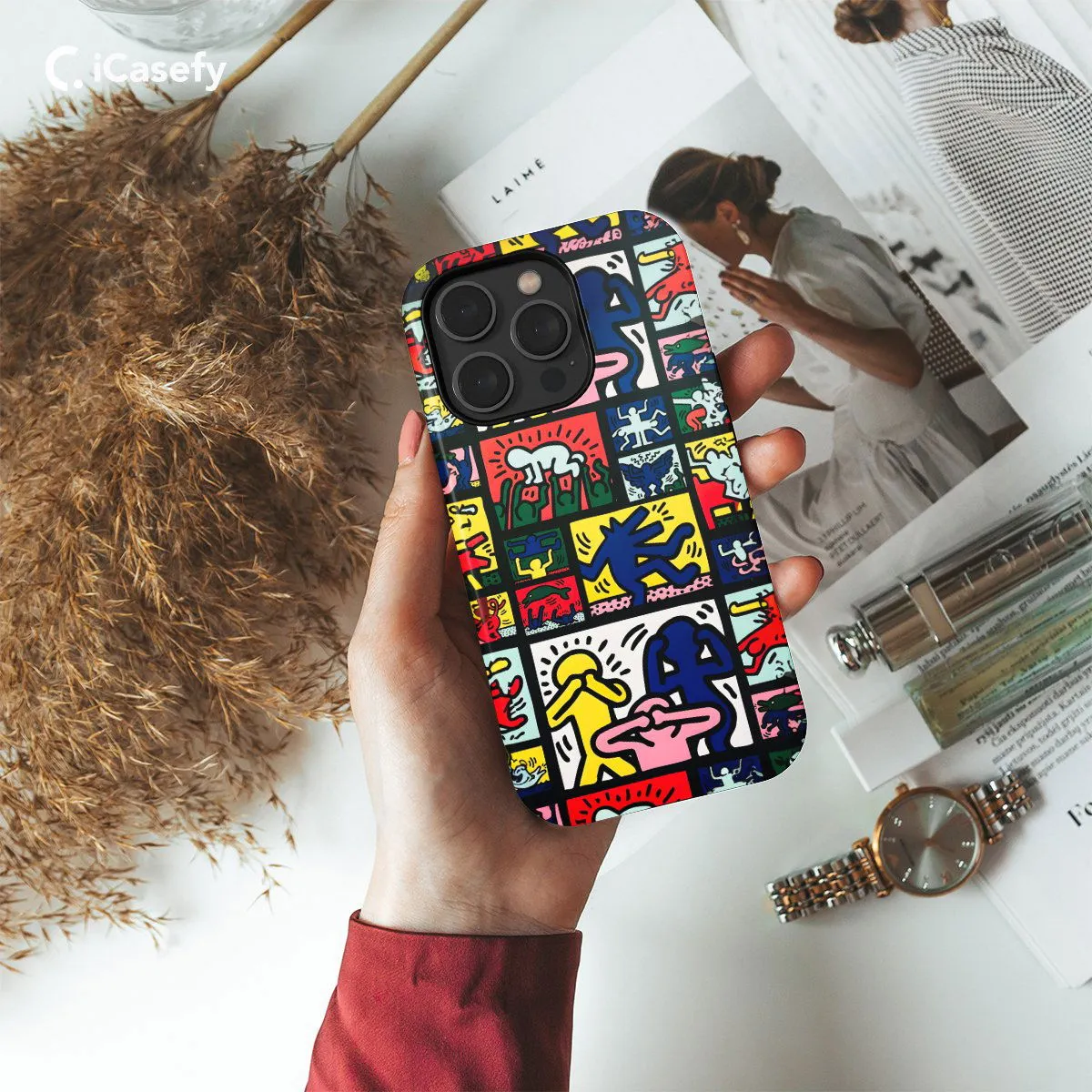 Celebrate the iconic art of Keith Haring with this vibrant phone case featuring his distinctive artwork. Adorned with Haring's signature bold lines and colorful figures, this accessory captures the energy and spirit of his renowned pieces. Carry a touch of artistic inspiration with you wherever you go, letting your device become a canvas for Haring's creativity and activism with this eye-catching and dynamic case.