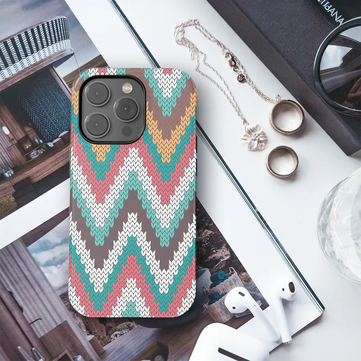 Accessorize your phone with style and protection with our Knitted Chevron Phone Case. Crafted from high-quality materials, this case snugly fits your iPhone, Samsung, or Pixel device, providing reliable protection from bumps, scratches, and everyday wear. Its unique knitted chevron pattern adds a touch of elegance to your mobile companion, making it a standout piece in your collection.